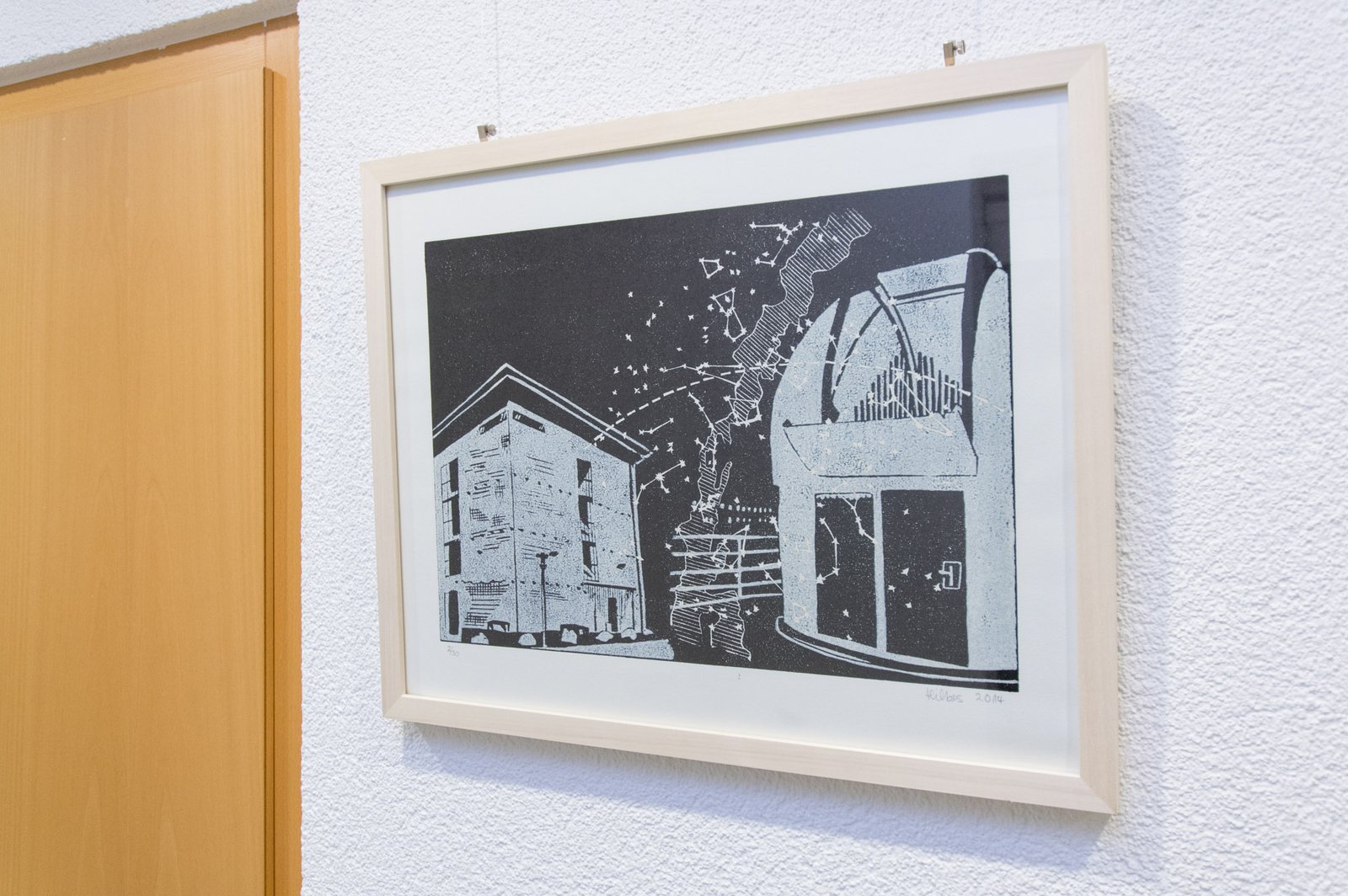 Der Linolschnitt "Sternwarte" der Künstlerin Karin Hilbers zeigt glatte Umrisse und klare Flächen. Motiv für das Negativmuster bieten hier der Bunker-D auf dem Campus der HAW Kiel und die Sternwarte auf dem Hochhaus des Fachbereis Wirtschaft, Soziale Arbeit und Gesundheit.