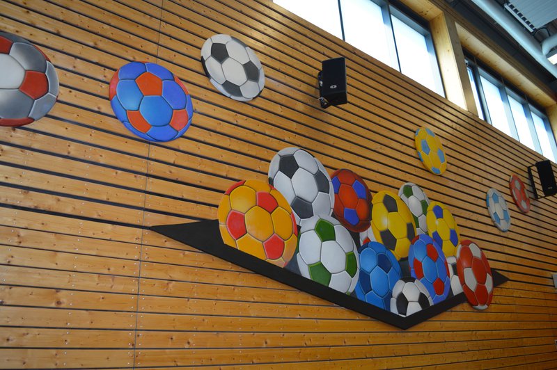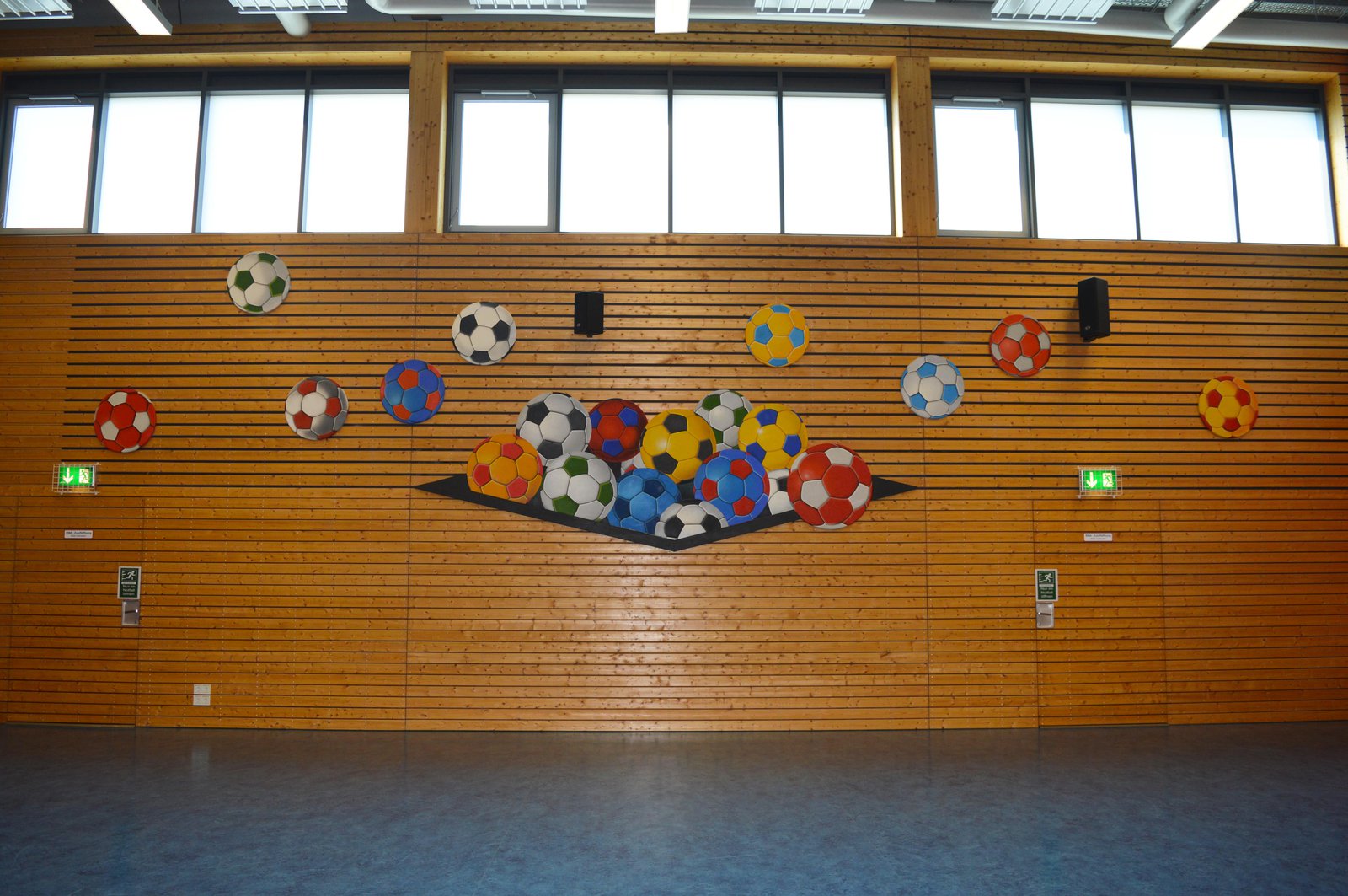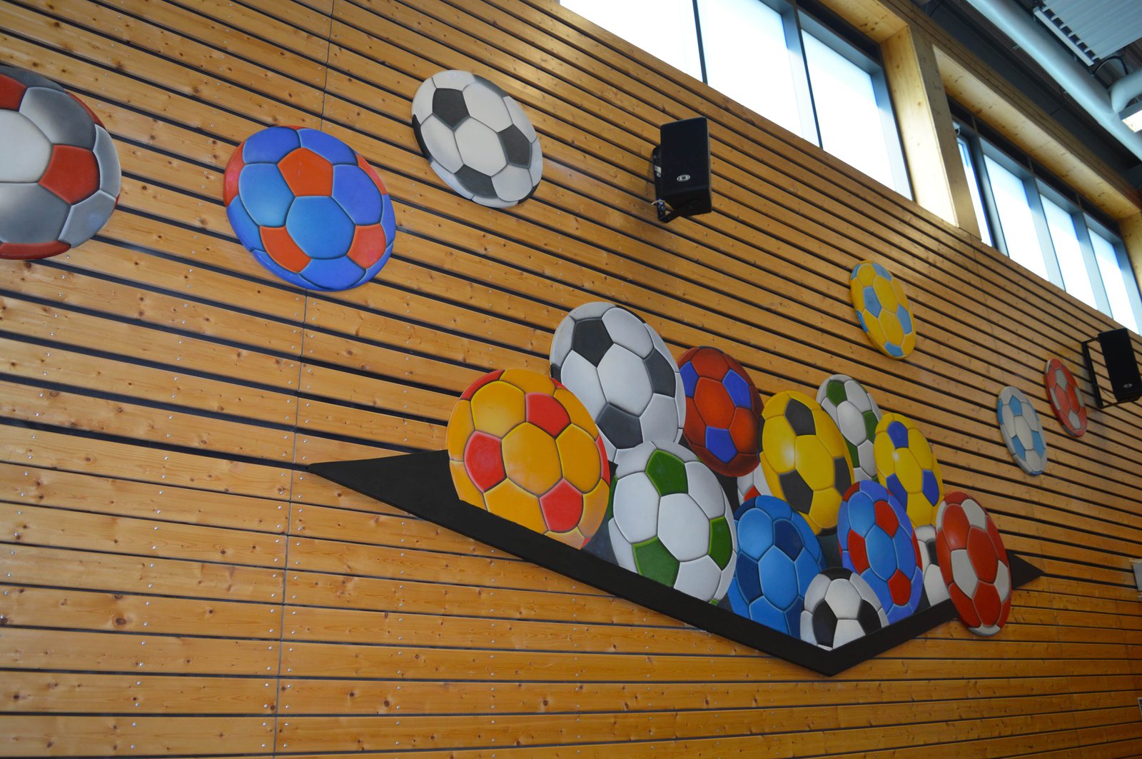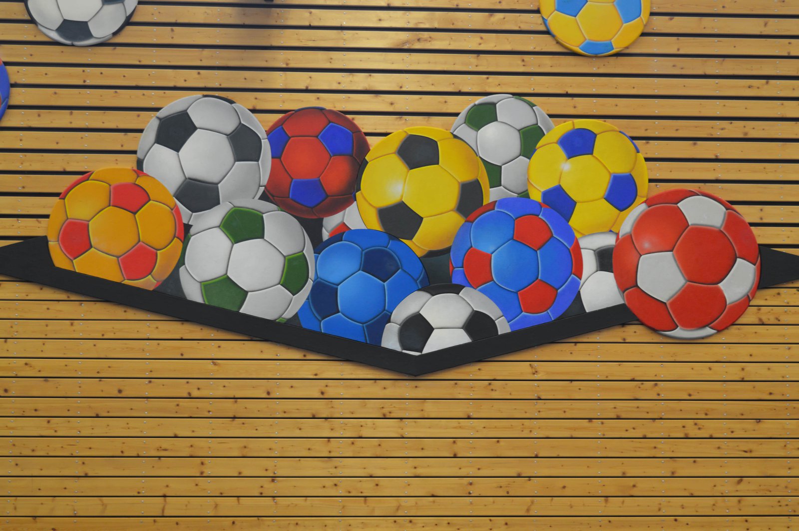 Die Installation „Fernsehfußbälle“ von Peter Nagel ist im Jahr 1976 für die Eiderhalle in Flintbek entstanden. Der Maler konzipierte für das Foyer der Sporthalle seine erste Installation: ein buntes, dynamisches Treiben aus Fußbällen. Durch eine Zweckentfremdung des Raumes wuchs jedoch die Idee, das Werk an einem anderen Ort zu platzieren. So kaufte der Künstler die „Fernsehfußbälle“ zu einem symbolischen Wert von der Gemeinde zurück und übergab sie in die Kunstsammlung der HAW Kiel.