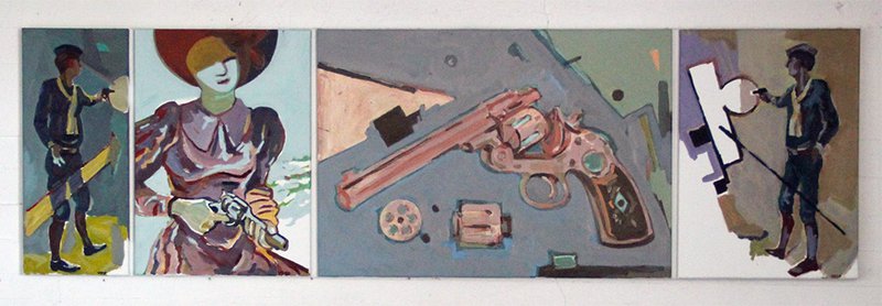 Das vierteilige Werk stammt aus Sitnikovs Arbeitszyklus "Hände hoch" und blieb nach der gleichnamigen Ausstellung im Jahr 2011 in der Galerie des Bunker-D auf dem Campus. Die Ausstellung behandelte die Entwicklung von Waffen zu Konsumartikeln und die damit verbundene allgegenwärtige Bedrohung.