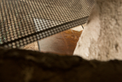 Die Materialien auf dem Bild von Volker Huschitt glänzen bronze im hellen, weißen Licht. Es scheint so, als würden sie sich in die rauhen Betonwändes des Bunker-D einreihen. Die Streben bohren sich förmlich durch das Werk und Huschitt spielt mit dem Thema Bunker und lässt Licht und Schatten auf der Leinwand tanzen. Er rückt das Ursprüngliche in den Vordergrund und macht darauß ein einzigartiges Kunstwerk.