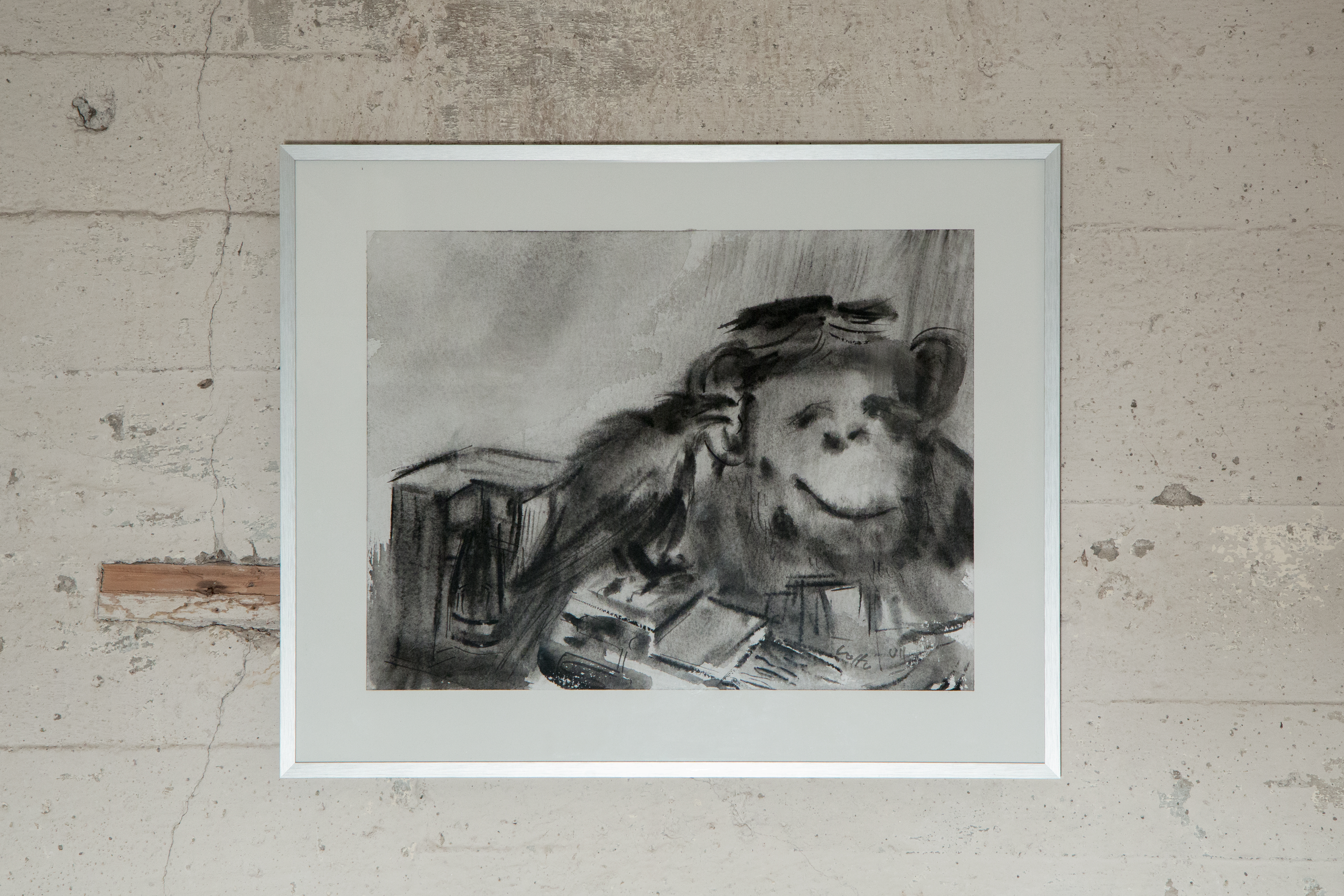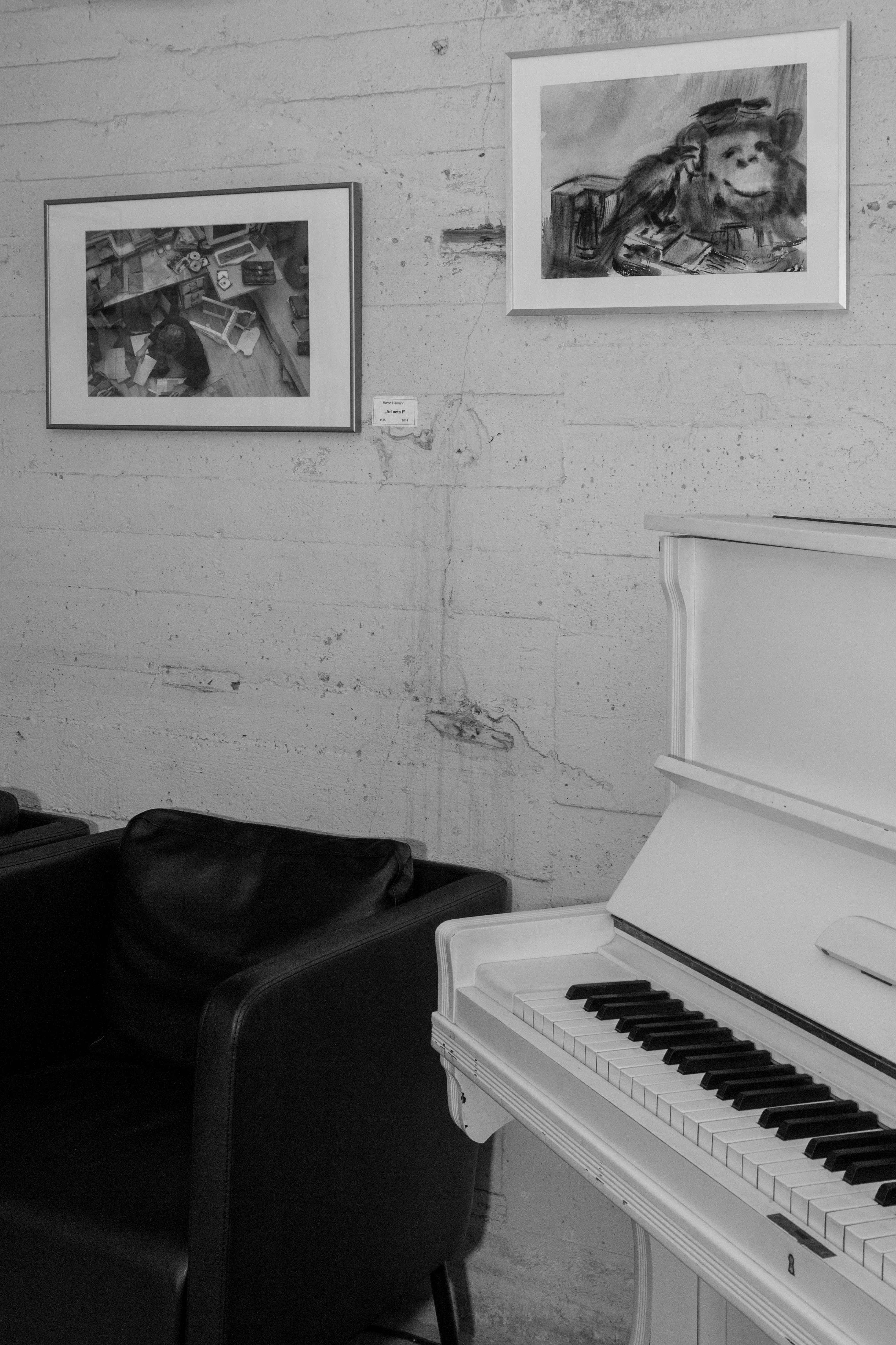 Ganz in schwarzweiß ragt ein kleiner Affe aus dem Bild über dem Klavier hervor. Lauscht er den Klängen oder ist er mit etwas ganz anderem beschäftigt? Volker Huschitt hat ihn jedenfalls mit straffen Pinselstrichen auf die Leinwand gebracht. Viele seiner Werke drehen sich um die Tierzucht, Zoos und Zirkusse. Er äußert sich durch seine Kunst zu Missständen in der Tierhaltung und gibt ein animalpolitisches Statement ab. Ist also unser Affe vielleicht auch einem Zirkus entsprungen?