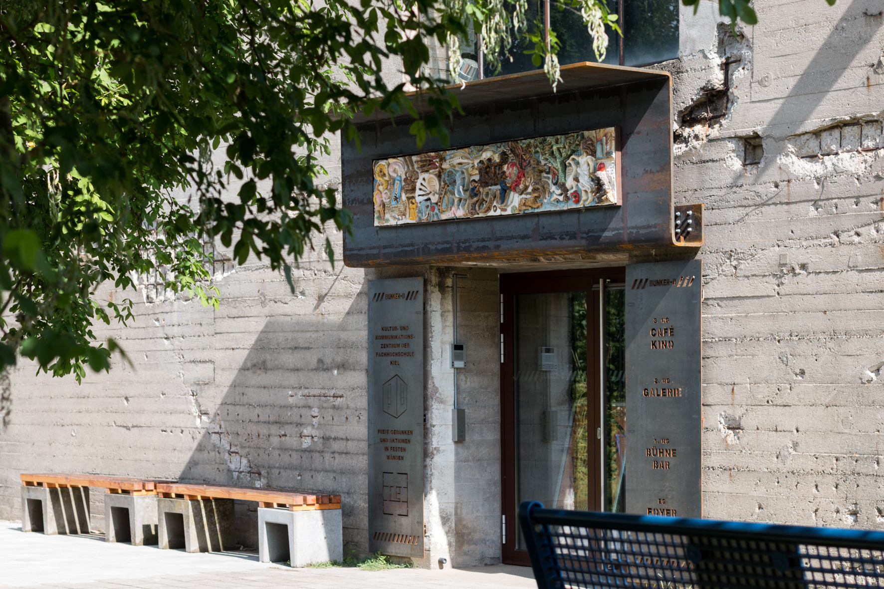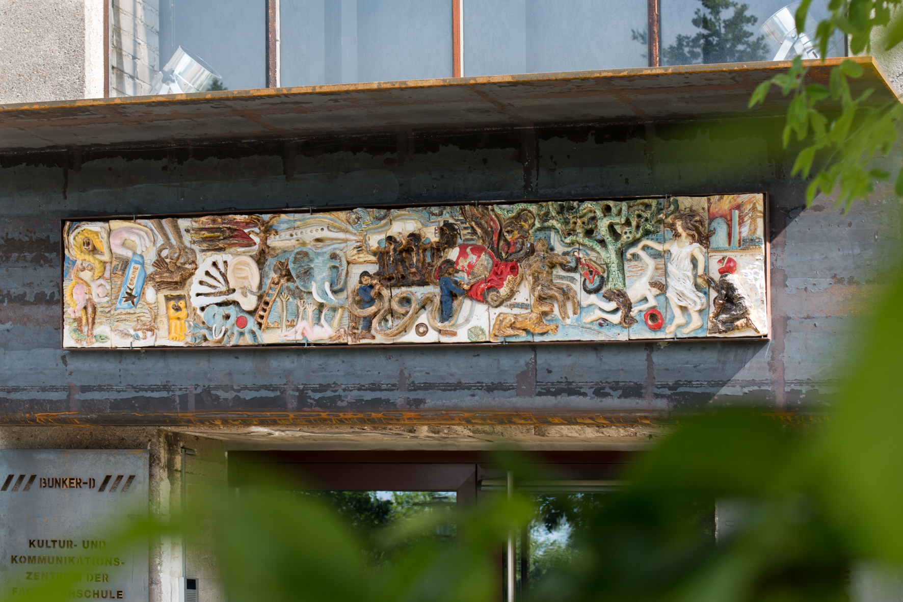Der einzige thematische Überbau rührt von der Idee her, modellhaft das berühmte Pergamon-Fries in die Gegenwart zu überführen. An den Dehnungsfugen kann man die Tagwerke wie bei einem Fresco gut ablesen. Diese sind von rechts nach links entstanden, darum folgt die Beschreibung auch dieser Richtung.