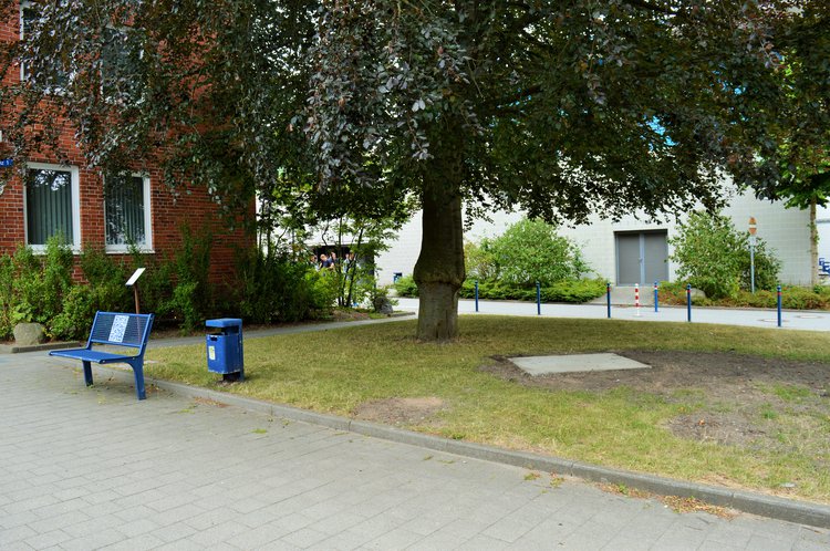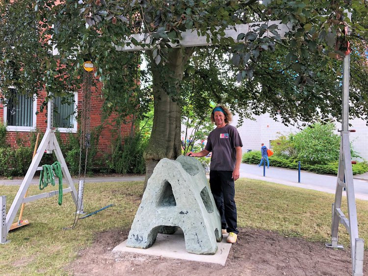 Jo Kley mit seiner Arbeit am neuen Standort vor dem Präsidiumsgebäude