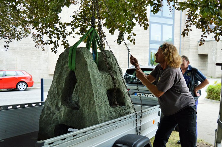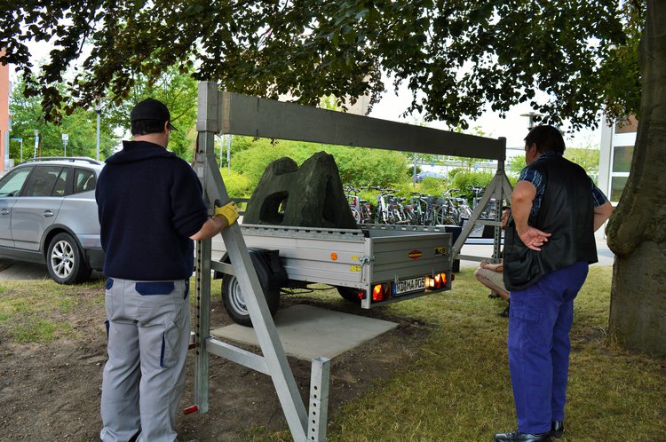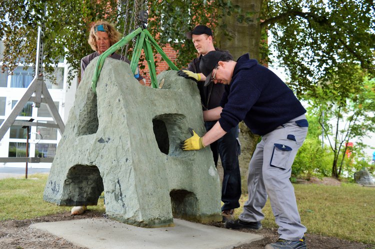 Mit gesammelten Kräften wurde die Skulptur präzise positioniert.