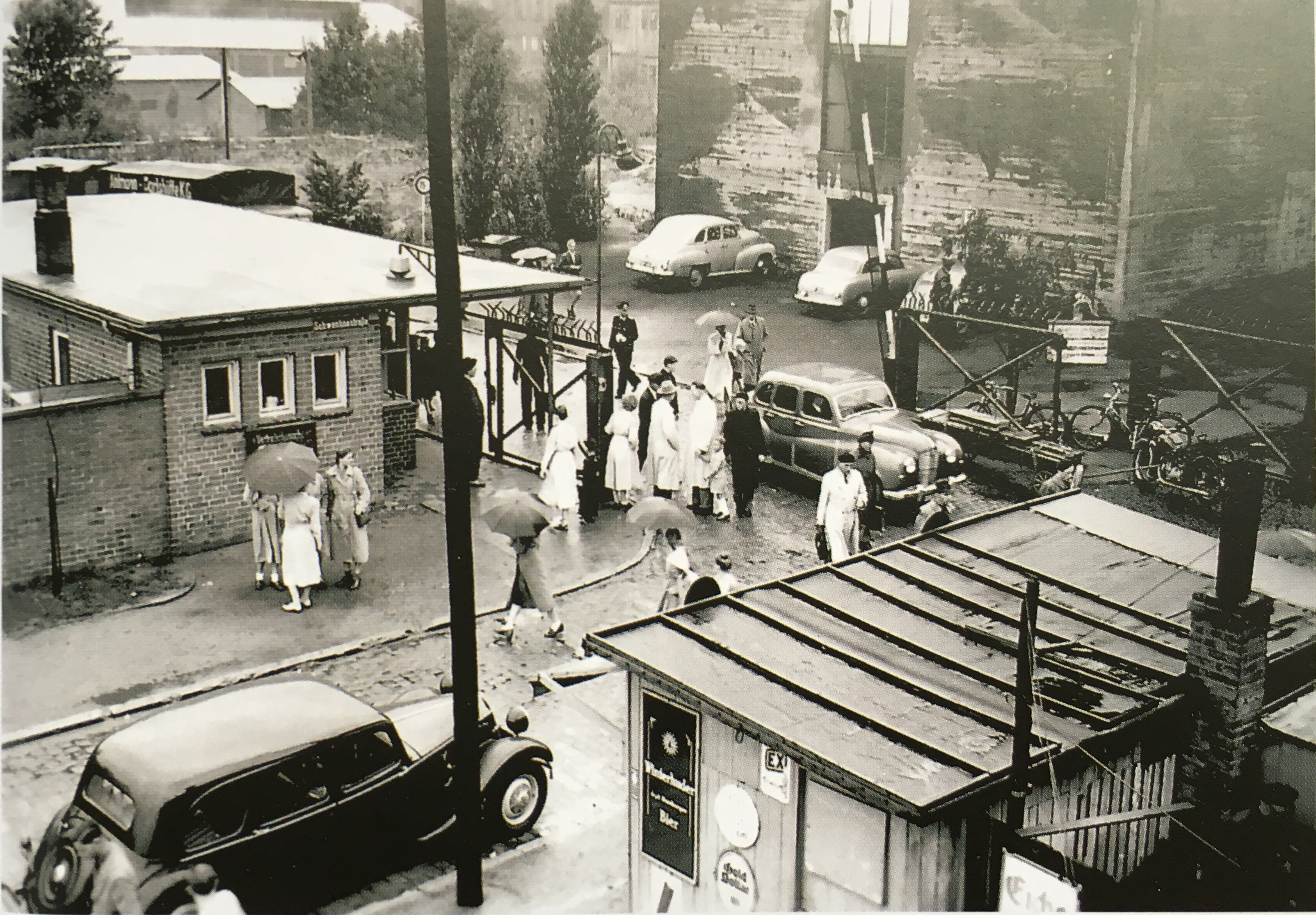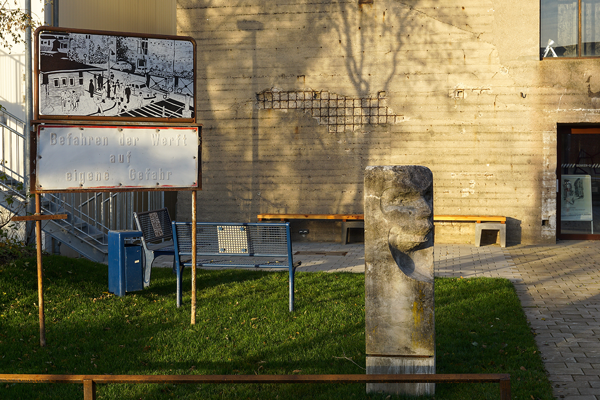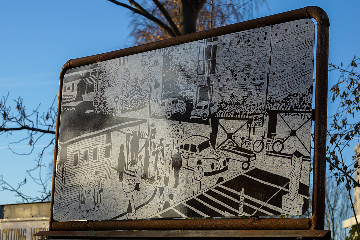 Nach einer Schwarzweiß-Fotografie aus den 50er Jahren hat die Künstlerin Karin Hilbers einen Linolschnitt gestaltet, der am Eingang zum Kultur- und Kommunikationszentrum Bunker-D als großformatige Reproduktion auf einem Blechschild angebracht ist. Die Szene „Werfttor am Zahltag“ wurde auf der historischen Fotografie eingefangen. Zu sehen ist das Pfortenwärterhäuschen mit einer Schranke an der damaligen Haupteinfahrt zur Werft (HDW). Hinten rechts ist der heutige Bunker-D erkennbar, vor dem damals Autos parkten. Fahrräder sind am Werftzaun abgestellt und zwei Dutzend Männer und Frauen, teilweise mit Hüten und Regenschirmen ausgestattet, warten oder laufen im Eingangsbereich des Werftgeländes. Das Kunstwerk erinnert an das geschäftige Treiben der Werftarbeiter an diesem Ort, denn früher passierten täglich Tausende den Haupteingang zu den Howaldtswerken Deutsche Werft AG (HDW), die von 1876 bis 1983 ihren Standort in Dietrichsdorf hatten. Besonders am Zahltag war der Andrang hoch, denn dann warteten die Ehefrauen am Werfttor auf ihre Gatten.