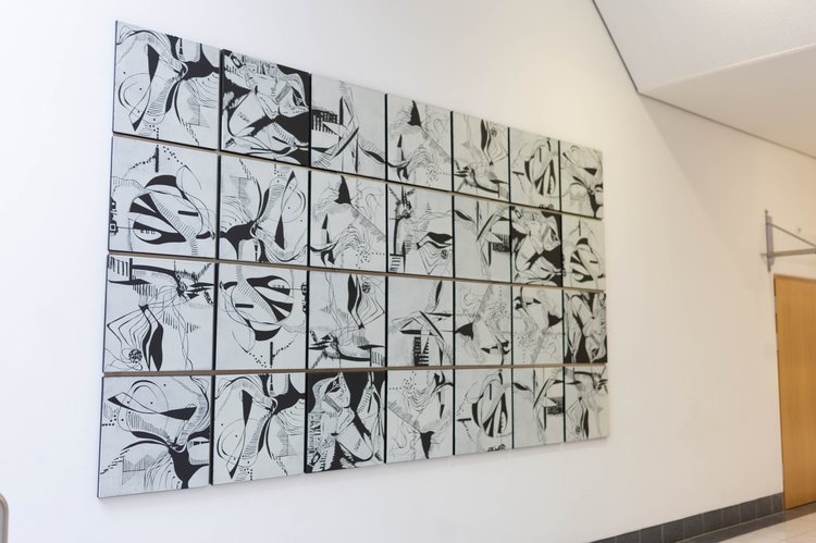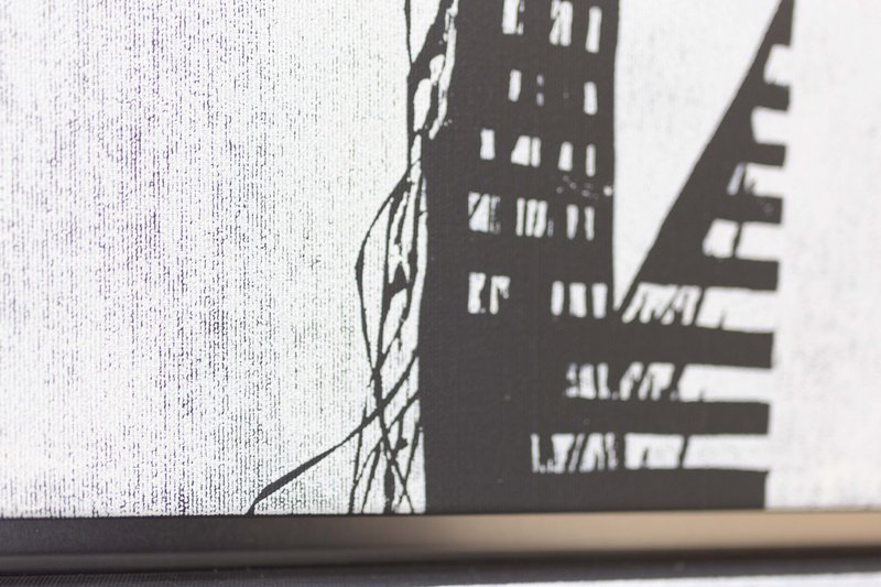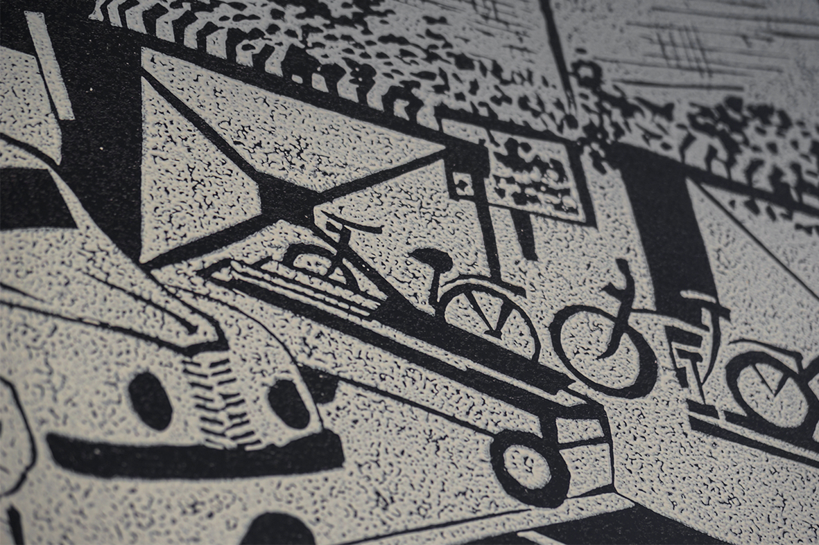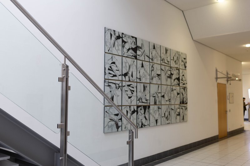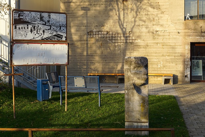 Der Original-Linolschnitt „Werfttor am Zahltag“ sowie die stark vergrößerte Reproduktion auf dem Schild, sind Teile der Sammlung CampusKunst-D der HAW Kiel.