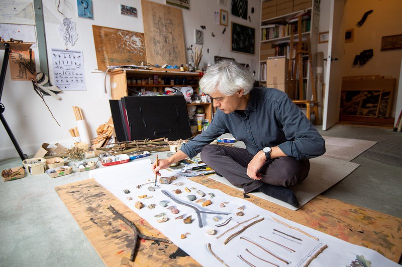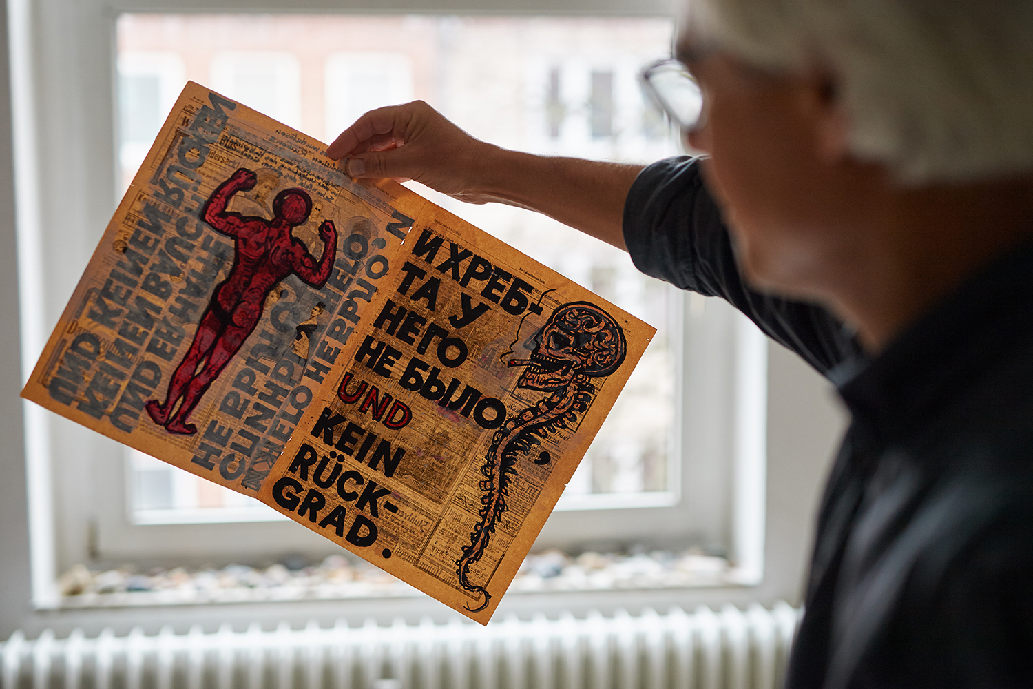 Bleigrau fällt das Kieler Herbstlicht durch hohe Altbaufenster. Der Besucher findet sich wieder in einem schlichten Raum mit hohen Decken, einem klassischen, hölzernen Schreibtisch, davor ein gemütlicher alter Lehnstuhl. Daneben Regale voll mit flachen Kisten: Künstlerbücher. Hinter den Gästen betritt Vladimir Sitnikov den Raum, in der Hand ein Tablett. Der Künstler bittet zu Tee, Keksen und zum Gespräch. Vladimir Sitnikov erinnert, wie alles begann – er ist ein leiser Mensch.