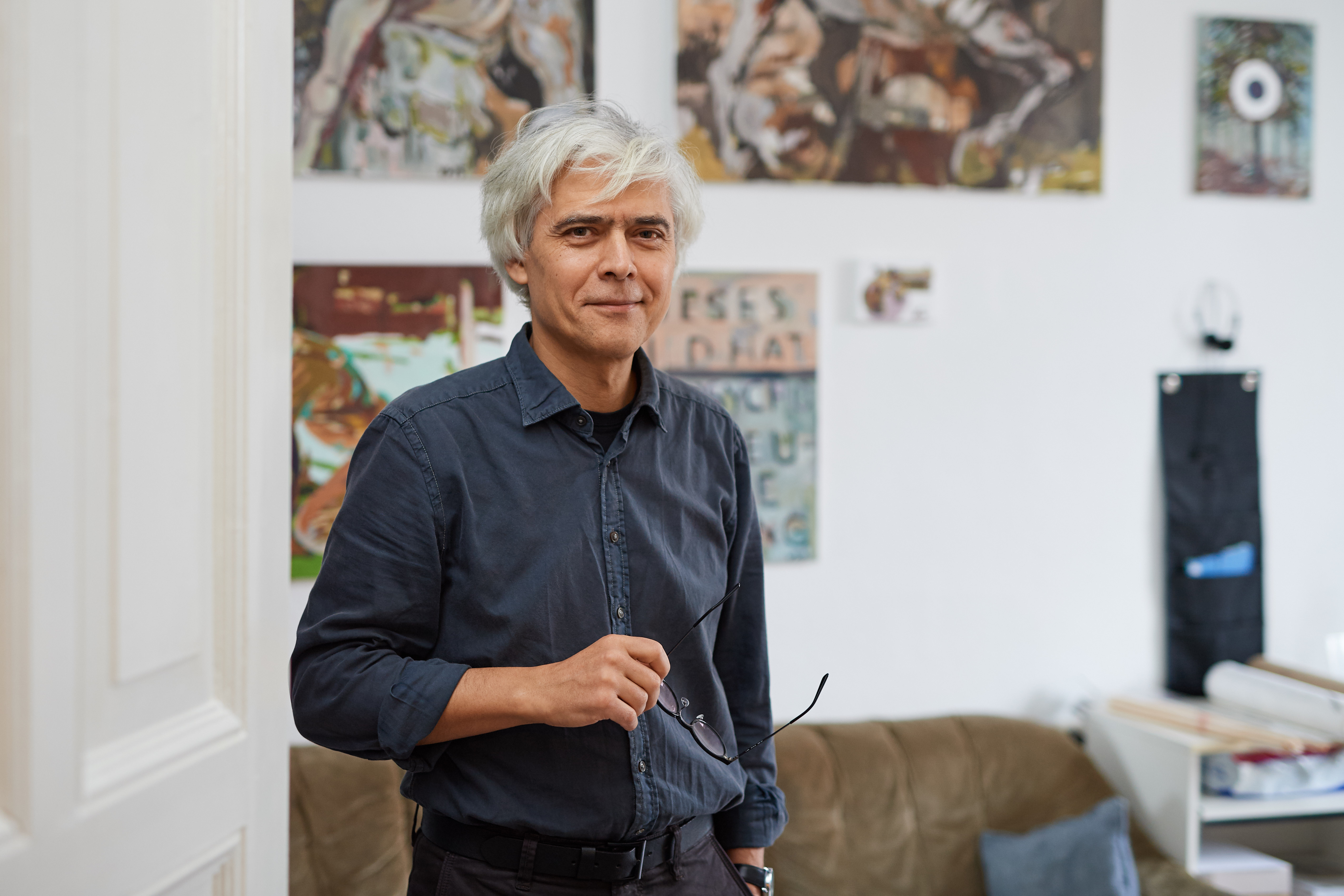 Unter dem Fenster liegen Federn auf dem Boden, Steine und Treibgut, feinsäuberlich sortiert auf einer dicken Unterlage. „Das nächste Projekt,“ sagt der Künstler mit einem Lächeln. An den Wänden finden sich Pistolen im Profil, grob freigeschnitten aus rostigem Metall. Sitnikov hat – wenn man so will – selbst so etwas wie eine rostige Vergangenheit hinter sich. Einst lebte und arbeitete er in Moskau, die Situation nach der politischen Wende trieb ihn dann hinaus, der Liebe wegen strandete er im Kieler Regen. Der studierte Buchgestalter und Moskauer Kunstjournalist begann hier neu: Zu Künstlerbüchern schuf er Objekte und widmete sich der Malerei. „Ich begreife mich als Maler; Bücher sind eine Welt, in der ich mich gerne befinde“, erklärt Sitnikov sein Schaffen. Zu den malerischen Auseinandersetzungen mit Literaten seiner Jugend oder seinem „Sehnsuchtsort Berlin“ finden sich immer wieder Begegnungen der Gegenspieler Ost und West: In Kultur, Politik, Prägung bekennt und untersucht Vladimir Sitnikov mit seinem Schaffen die Begegnung beider Welten.