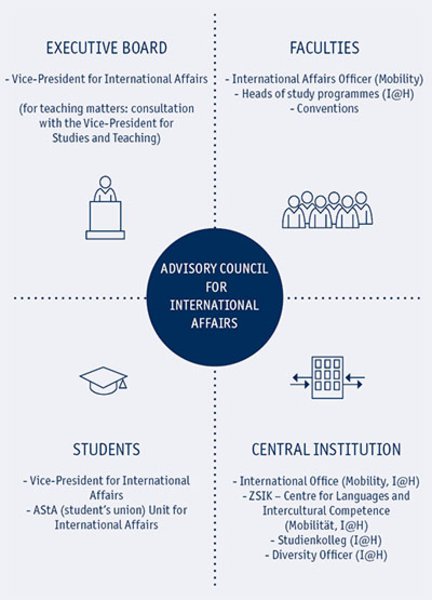 - represents the faculty on the Advisory Council for International Affairs and at the ZSIK and reports on activities abroad,