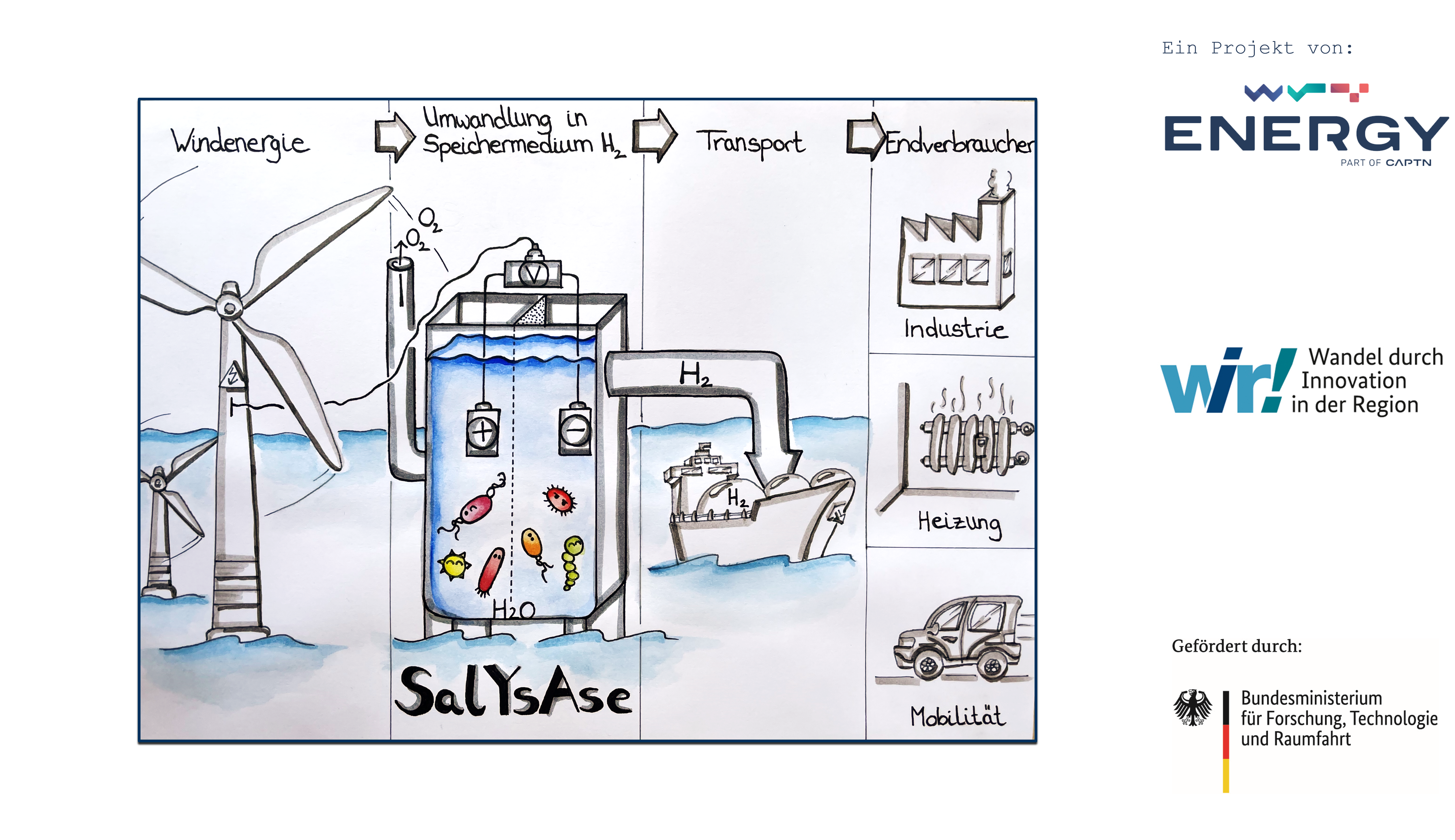 Im CAPTN Energy Verbundprojekt SalYsAse, das durch das BMFTR gefördert wird, wird daran gearbeitet, innovative technologische Ansätze zu entwickeln, um Meerwasser direkt für die Wasserstoffproduktion mit Hilfe von Biokatalysatoren effizient zu nutzen. Die Salzwasserelektrolyse ermöglicht es, „grünen Wasserstoff“ aus dem Strom, der von Offshore-Windenergieanlagen erzeugt wird, herzustellen. Marine Mikroben sollen herkömmliche Katalysatorschichten auf porösen Gasdiffusionsschichten ersetzen oder ergänzen. Ziel ist außerdem, die elektrochemische Langzeitperformance sicherzustellen und so einen kostengünstigen und wartungsarmen Demonstrator zu schaffen. Die biokatalytische Aktivität soll dabei Überspannungen an den Elektroden verringern, unerwünschte Nebenreaktionen reduzieren und damit eine vorherige Wasseraufbereitung überflüssig machen, um den Prozess der Wasserstofferzeugung aus Meerwasser umweltfreundlicher und kostengünstiger zu gestalten. Das Projekt wird in enger Zusammenarbeit mit Mikrobiologinnen des GEOMAR Helmholtz-Zentrum für Ozeanforschung sowie Materialwissenschaftlern des Technologieunternehmens Element22 GmbH durchgeführt.