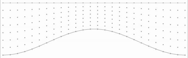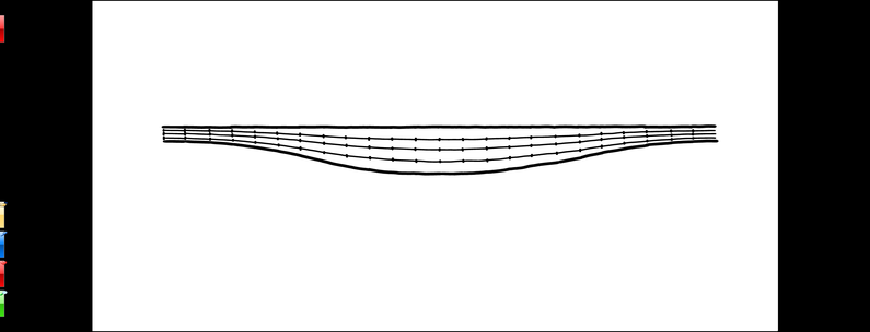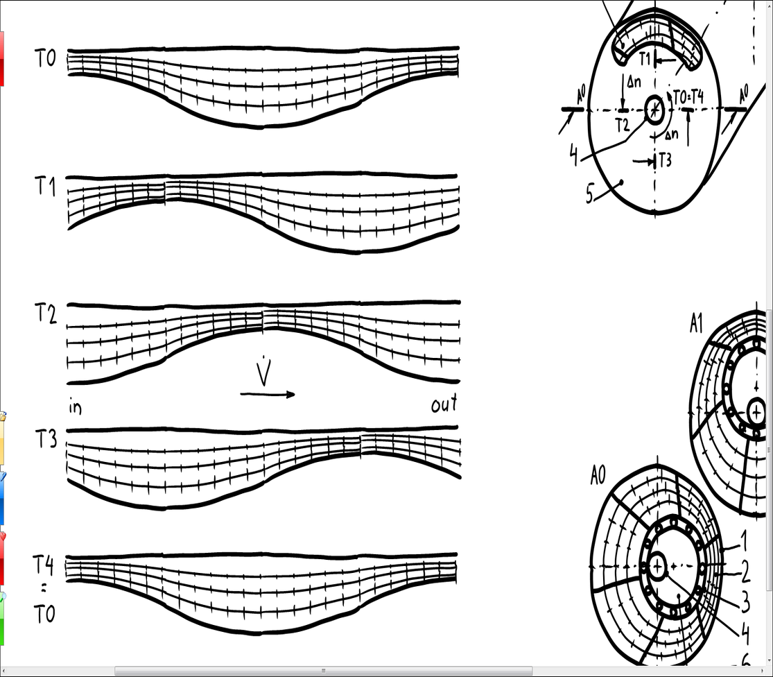 Zum Zeitpunkt t0 ist der Einlass „in“ verschlossen. Über den Zeitpunkt t1 öffnet sich dieser bis zum Maximum in t2. Ab dann schließt dieser wieder über t3 bis t4, was der Ausgangsstellung t0 entspricht. Während des Vorganges wandert der Sinusberg in Förderrichtung und ist an beiden Tiefpunkten durch das zusammengedrückte Filtermaterial und ggf. ein filterwirksames Fluid verschlossen. Das eingeschlossene Aerosol wird also durch den sich verjüngenden Querschnitt – wie in den Alveolen beim Ausatmen – angetrieben. Alle hier nicht anhaftenden Partikel müssen das gesamte Filtermedium auf dem Weg zum Ausgang durchlaufen. Der Auslass „out“ ist in t0 ist ebenfalls verschlossen. Über den Zeitpunkt t1 öffnet sich dieser bis zum Maximum in t2, wobei das gefilterte Aerosol entlassen wird. Ab dann schließt dieser unter weiterer Austreibung wieder über t3 bis t4, was auch hier der Ausgangsstellung t0 entspricht.