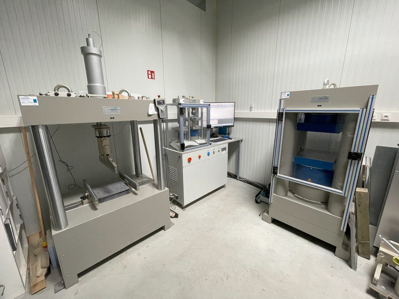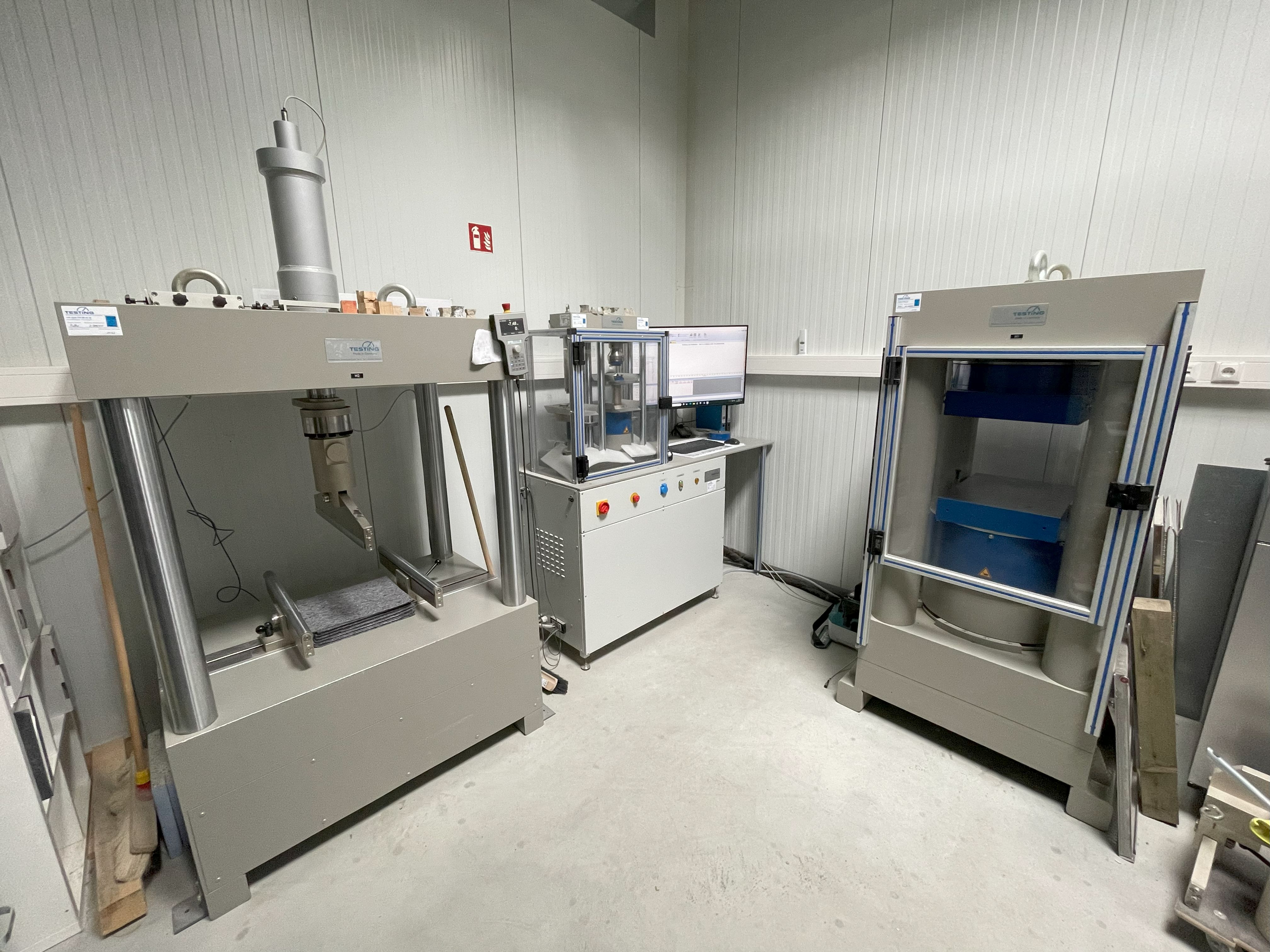 - Kombinierter Druck- und Biegeprüfrahmen (300kN, 10 kN) u.a. zur Prüfung der Druck- und Biegezugfestigkeit an Zement-, Mörtel- und Gipsproben sowie Leicht- und Porenbeton