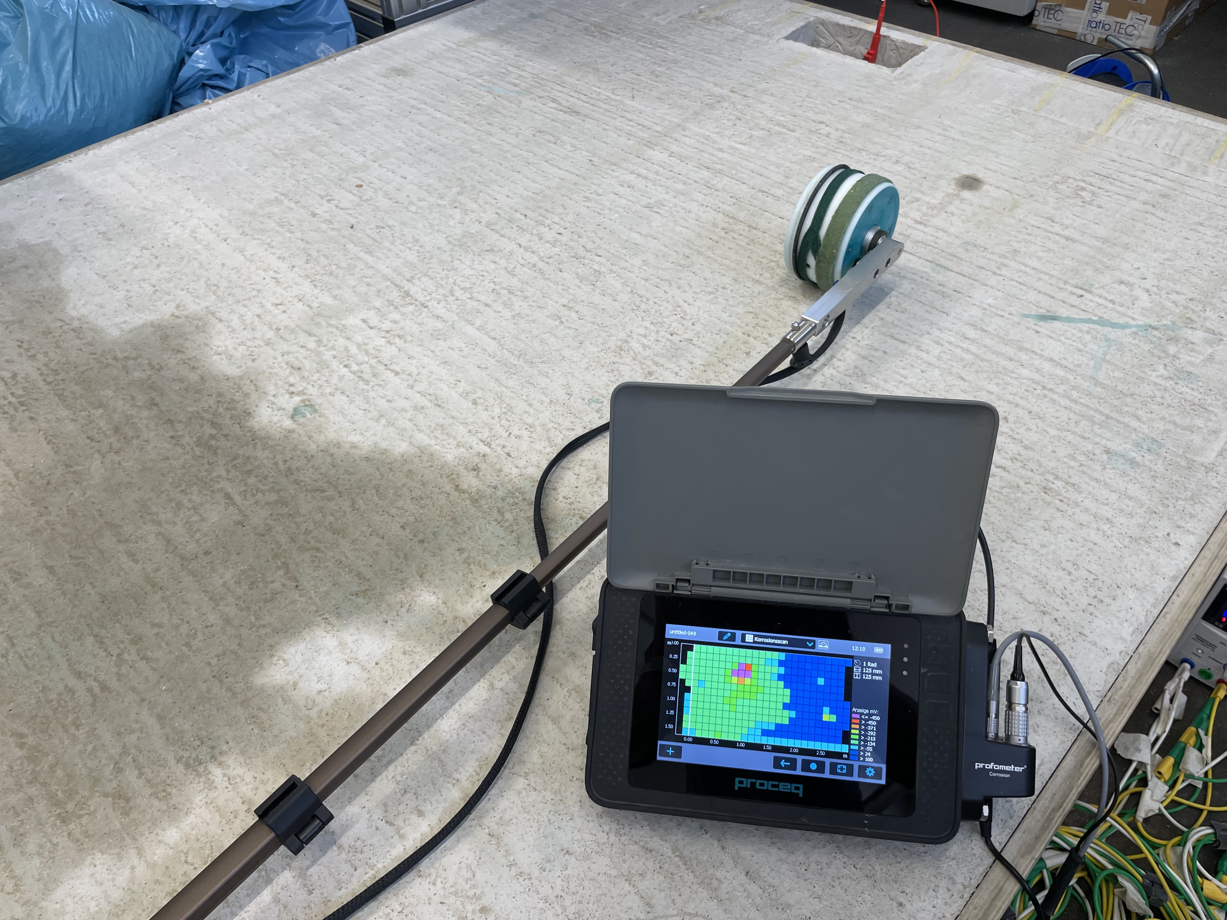 - Potentialfeldmessung: Zerstörungsarme Lokalisierung von Bereichen mit erhöhter der Korrosionswahrscheinlichkeit der Bewehrung an Stahlbetonbauteilen
