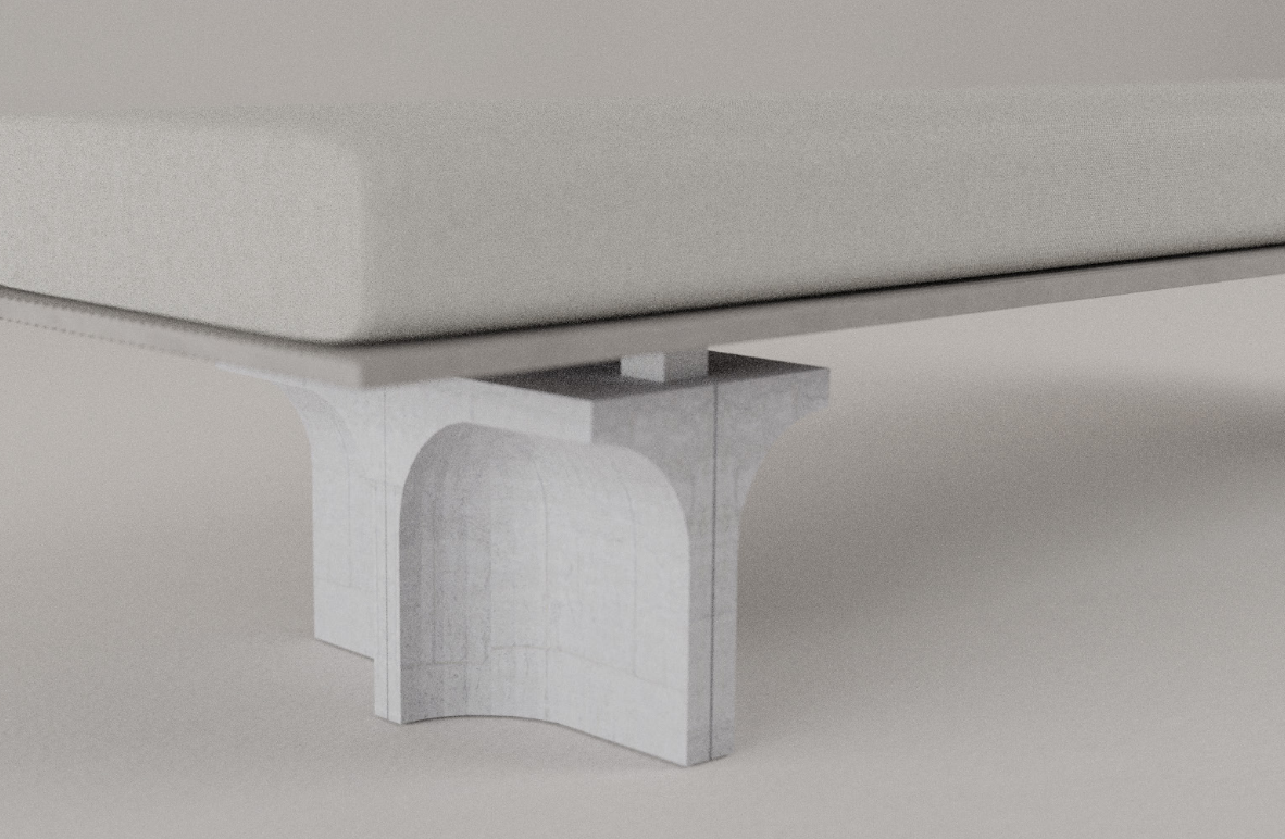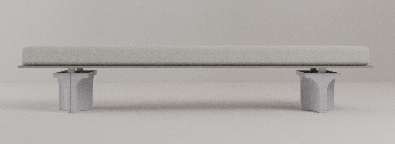 Ein wesentlicher Aspekt des Entwurfs umfasst die Verwendung unterschiedlicher Betone. Die auf Biegung beanspruchte Sitzflächen werden möglichst schlank ausgeführt. Der innovative Baustoff Textilbeton ist für diese Aufgabe hervorragend geeignet. Bei Textilbeton handelt es sich um Feinbetone in die technische Textilgelege, z.B. aus Carbon, Glasfaser oder Basalt, eingelegt werden um die Tragfähigkeit zu erhöhen. Durch die sehr gute Korrosionsbeständigkeit der Gelege können die Betondeckungen stark reduziert werden, wodurch sehr schlanke Konstruktionen ermöglicht werden. Der Feinbeton wurde so entwickelt, dass etwa die doppelten Druckfestigkeiten im Vergleich zu Normalbeton erreicht werden. Die Stützfüße der Bank werden aus Normalbeton ausgeführt und stehen somit im Kontrast zu der Sitzfläche.