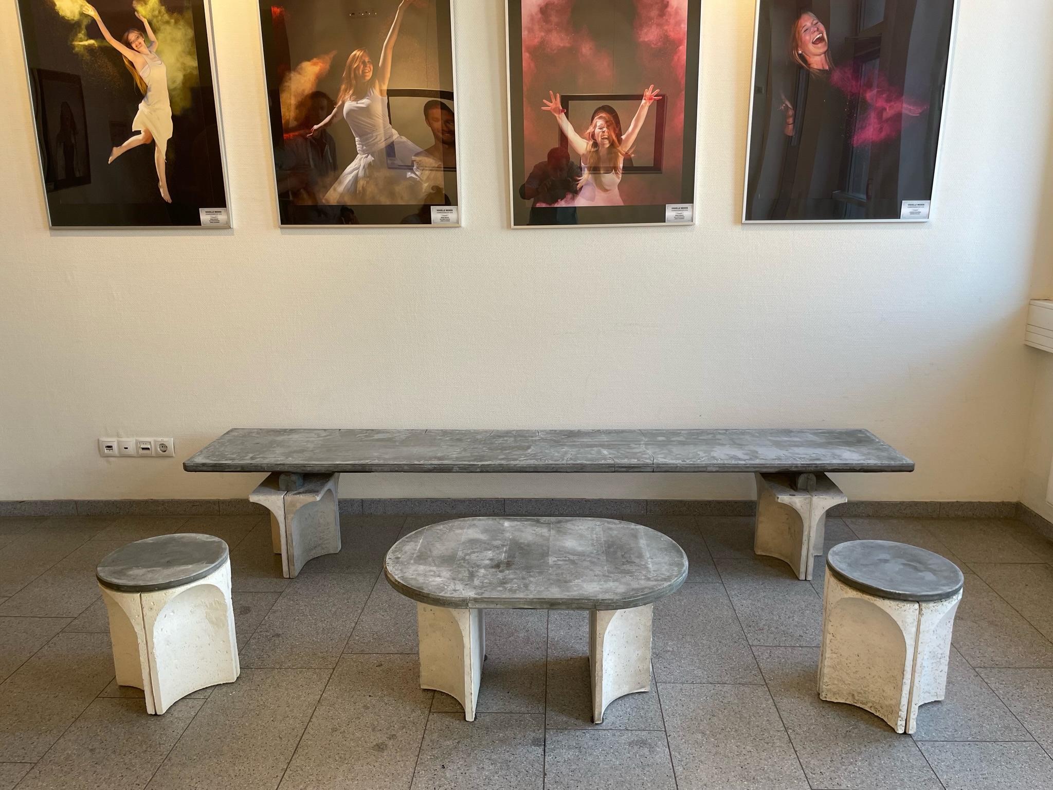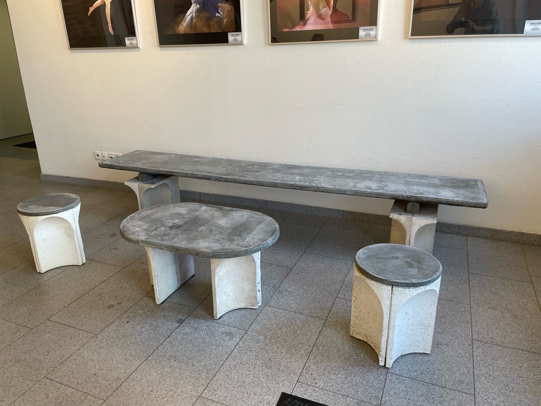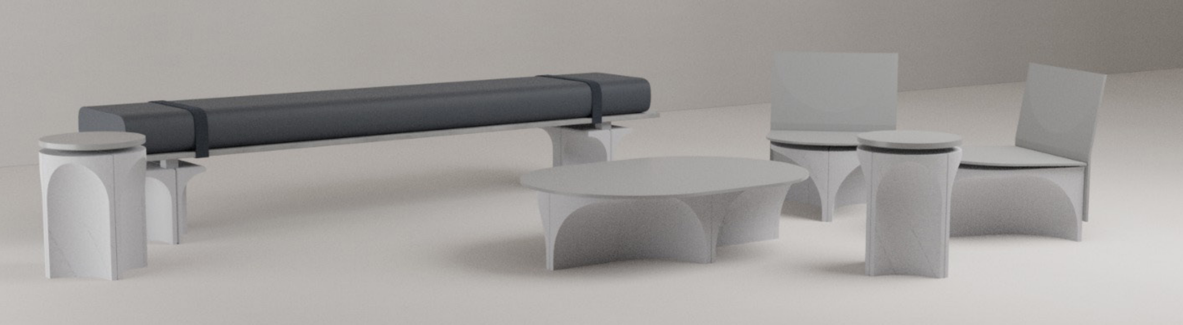 Auf der Basis des Grunddesigns wurde ebenfalls ein Hocker und ein Tisch abgeleitet. Die Hocker sollen durch die Nutzer verschoben werden können, daher werden die Standfüße aus Leichtbeton hergestellt. Der Leichtbeton wurde im Rahmen einer Bachelorarbeit entwickelt und enthält Sägespäne zur Reduktion der Rohdichte.