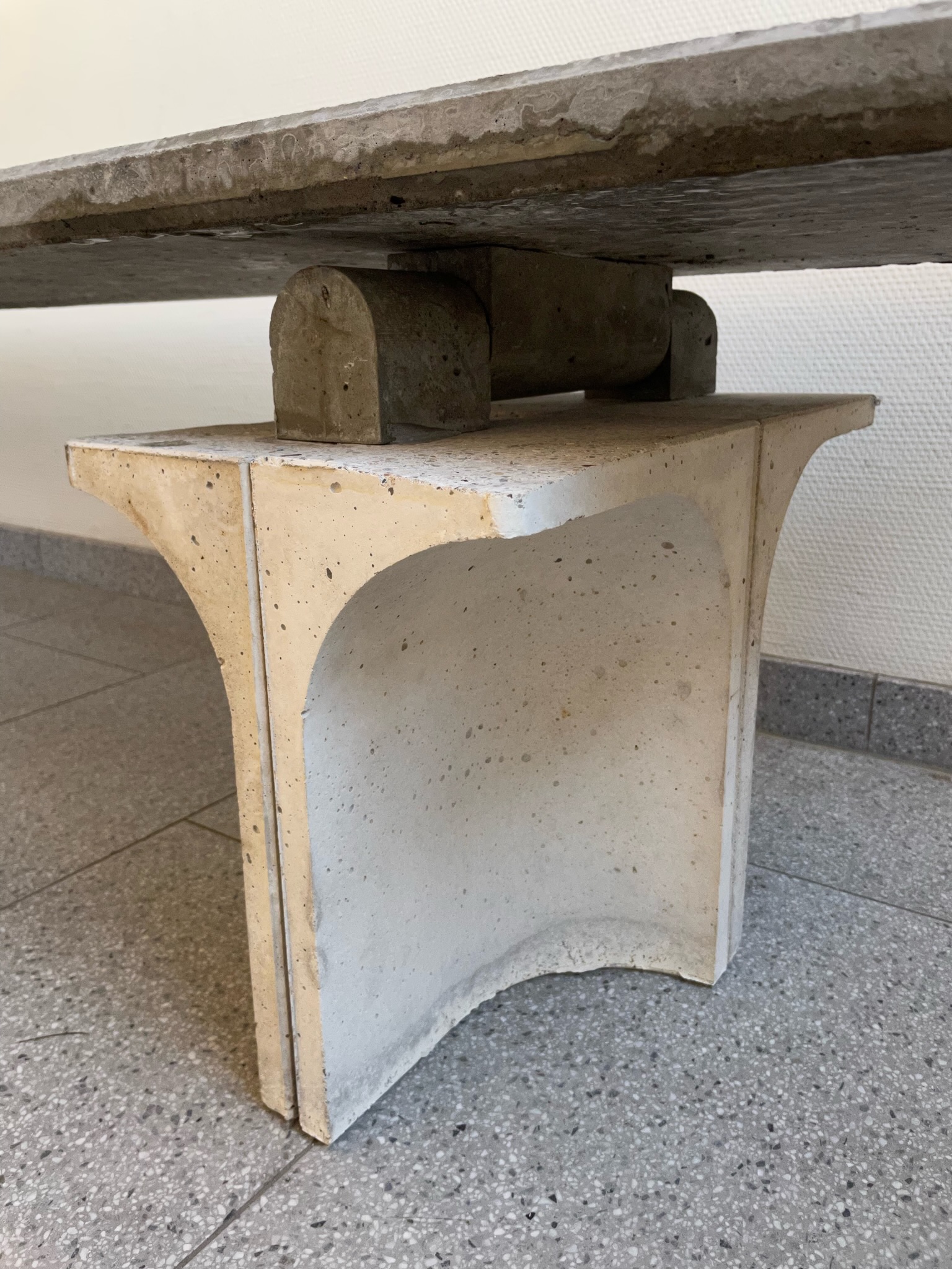Die Sitzfläche der Sitzbank sollte sehr schlank ausgeführt werden und wurde aus einem ultrahochfesten Feinbeton mit zweilagigem Carbongelege hergestellt. Neben dem modernen Werkstoff Textilbeton kommt im Kontrast hierzu für die Standfüße ein Normalbeton zum Einsatz.