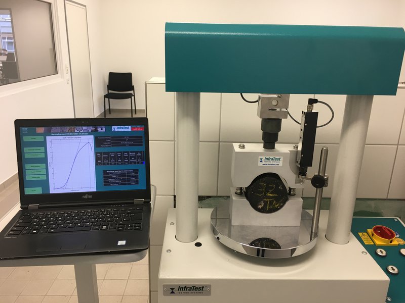 Das Gerät erlaubt eine vollautomatische Auswertung und kann bei Anschluss eines Laborrechners ein Kraft-Verformungsdiagramm generieren, das sofort zur Verfügung steht und alle wichtigen Messwerte und Auswertungen zeigt (z. B. Marshall-Quotient, Fließwert, Stabilität, tangentialer Fließwert usw.).