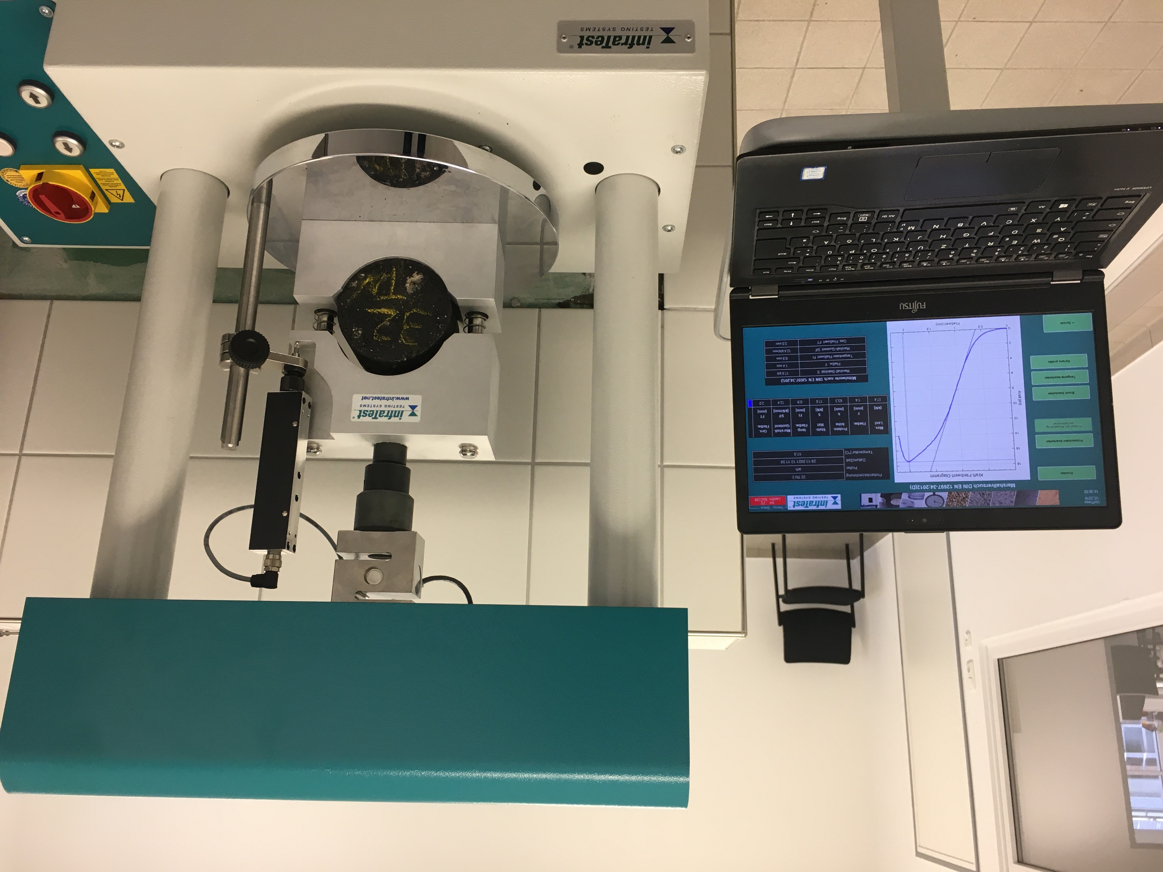 Das Gerät erlaubt eine vollautomatische Auswertung und kann bei Anschluss eines Laborrechners ein Kraft-Verformungsdiagramm generieren, das sofort zur Verfügung steht und alle wichtigen Messwerte und Auswertungen zeigt (z. B. Marshall-Quotient, Fließwert, Stabilität, tangentialer Fließwert usw.).