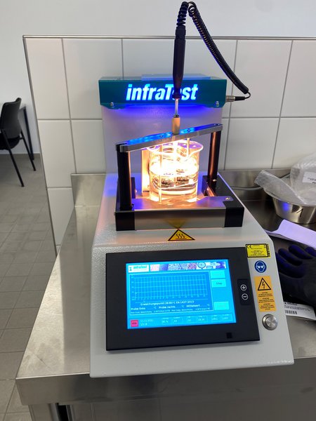 Die Bestimmung des Erweichungspunktes "Ring und Kugel" nach DIN EN 1427 gibt einen Hinweis auf das Verhalten von Bitumen bei hohen Temperaturen. Bei der Ermittlung wird die Temperatur bestimmt, bei der eine in einen genormten Ring unter festgelegten Randbedingungen eingefüllte Bitumenschicht bei gleichmäßiger Erwärmung in einer Prüfflüssigkeit eine festgelegte Verformung durch Auflegen einer Stahlkugel erfährt. Unser Labor verfügt über ein hochmodernes Gerät, mit dem eine vollautomatische Auswertung möglich ist.
