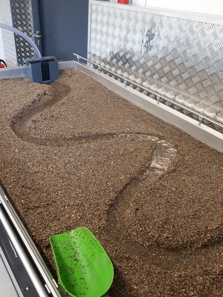 Mit diesem mobilen Versuchsstand kann der sohlnahe Geschiebetransport bei unterkritischem Abfluss demonstriert werden. Innerhalb der Versuchsstrecke können Flussläufe modelliert und deren morphologische Entwicklung beobachtet werden.