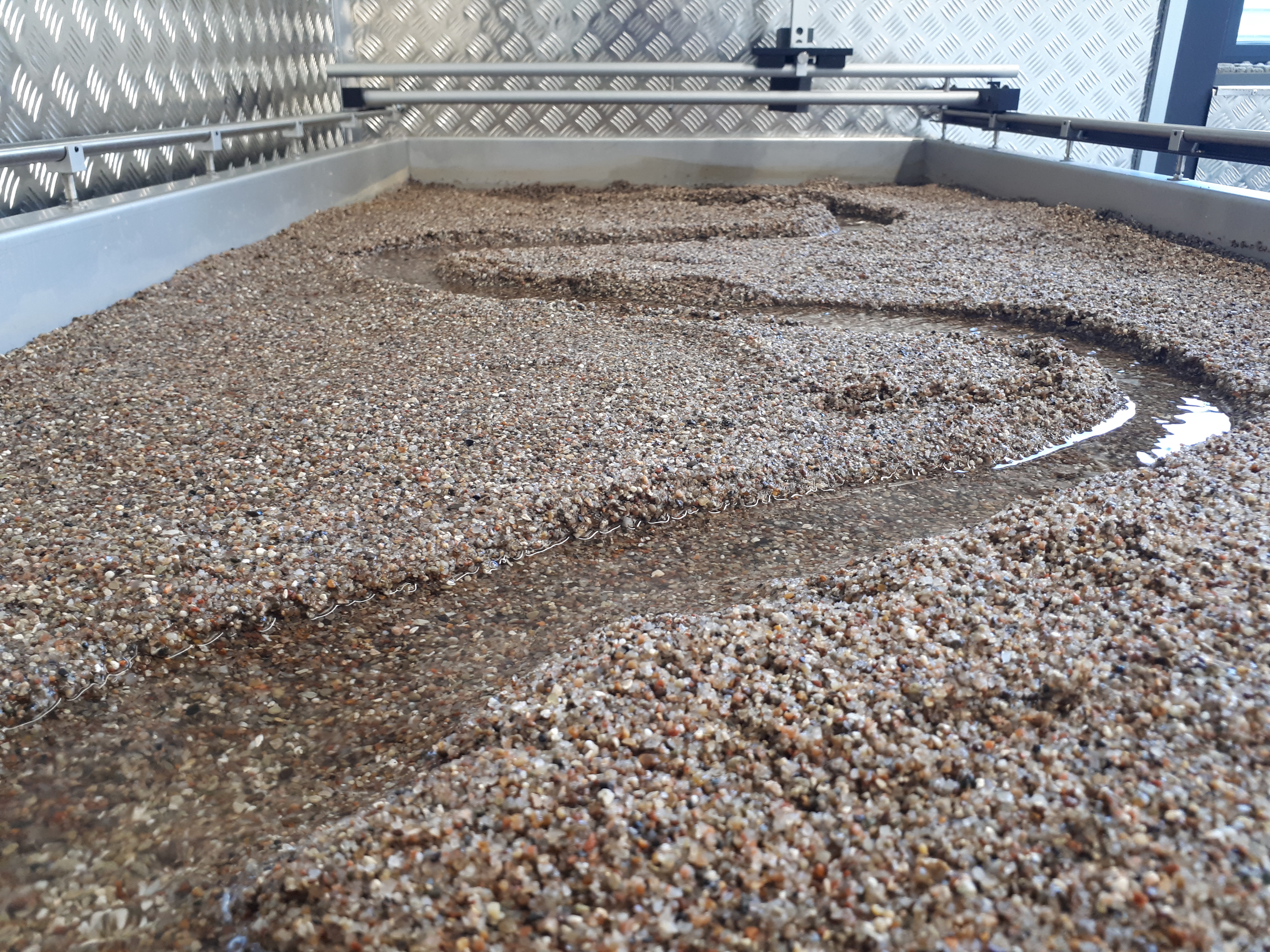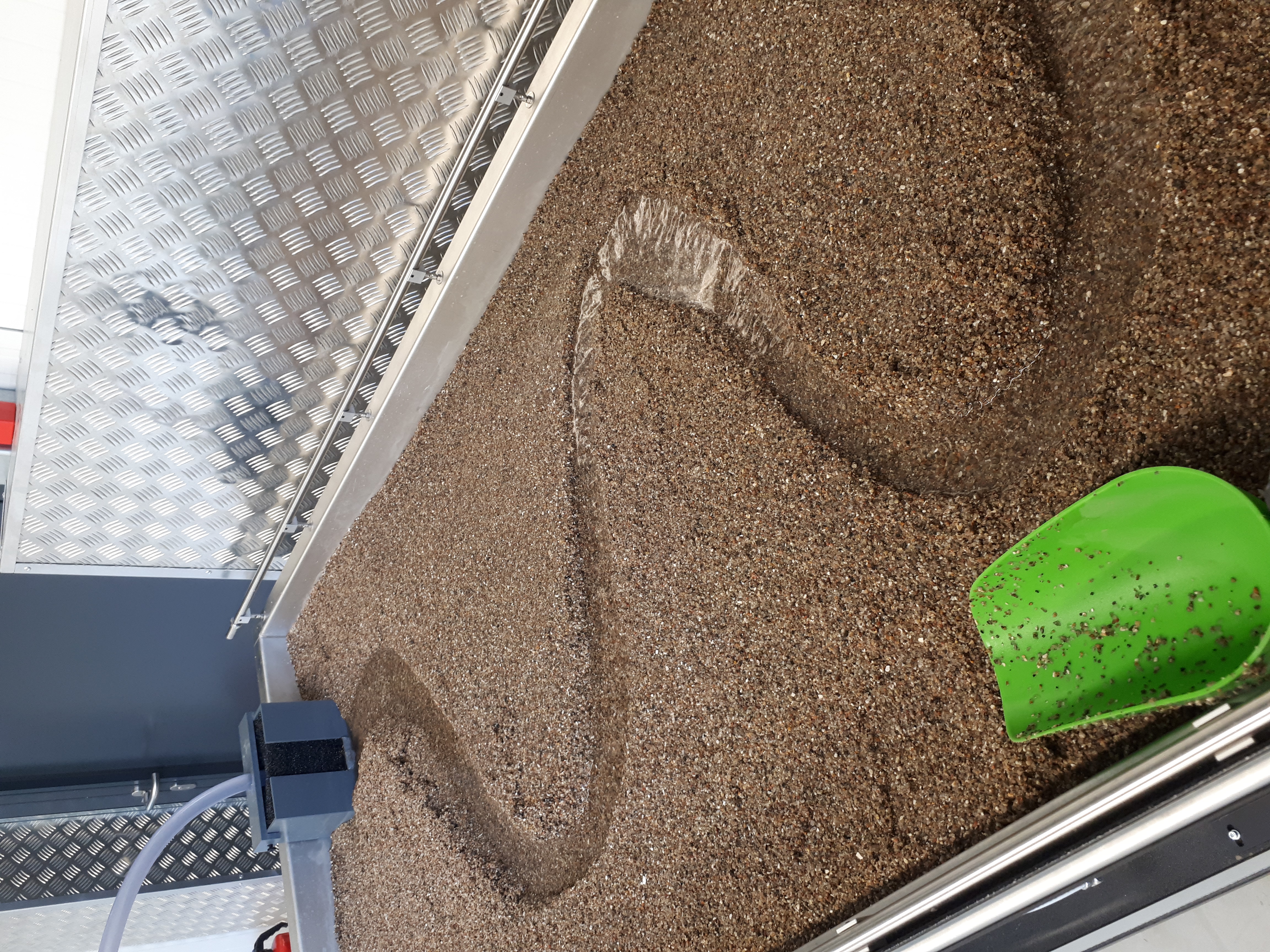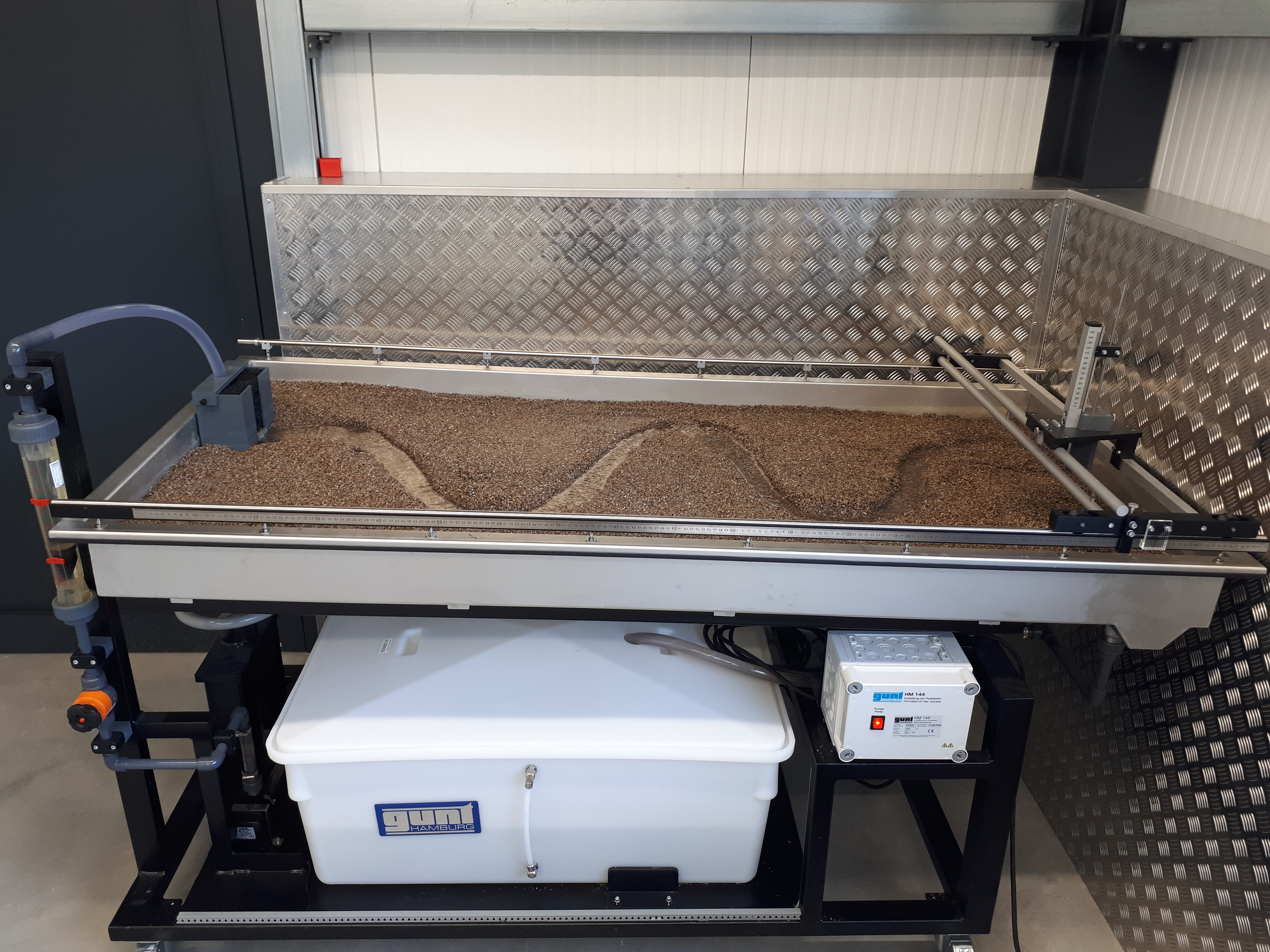 Mit diesem mobilen Versuchsstand kann der sohlnahe Geschiebetransport bei unterkritischem Abfluss demonstriert werden. Innerhalb der Versuchsstrecke können Flussläufe modelliert und deren morphologische Entwicklung beobachtet werden.