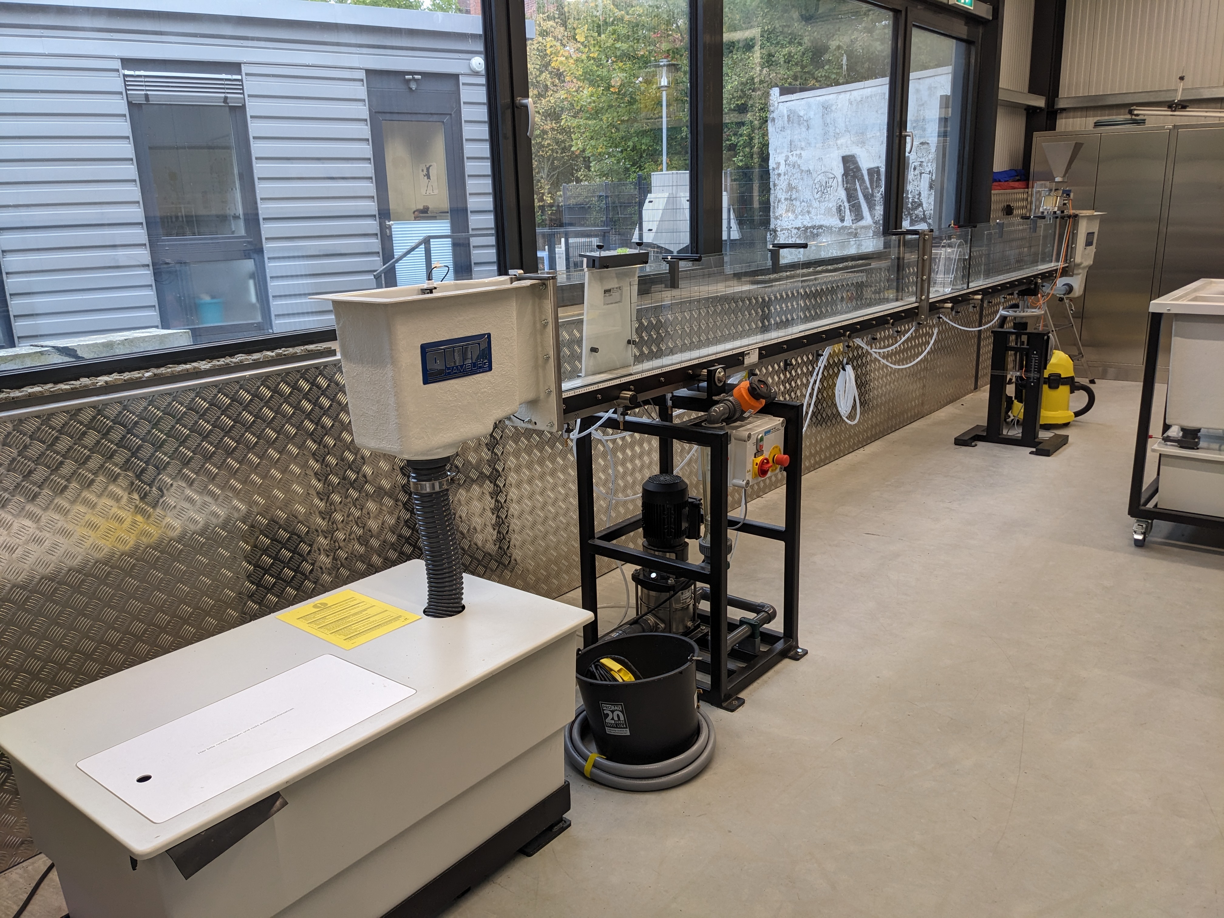 Die kleine Versuchsrinne hat einen Querschnitt von 8,6cm x 30cm und eine Versuchsstrecke von 5m Länge.