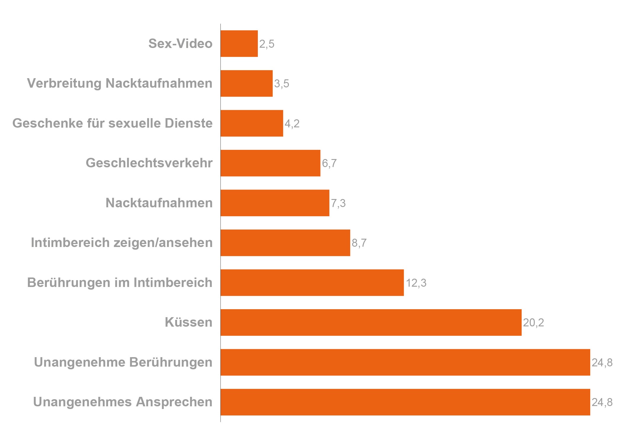 „Jugendliche erleben manchmal, dass andere sich ihnen gegenüber in unangenehmer Weise sexuell verhalten. Seit du in dieser Wohngruppe lebst, hast du irgendeine der folgenden Sachen erlebt?“ Diese Forschungsfrage war Ausgangspunkt der Interviews mit den Jugendlichen. Einen Überblick über die sexuellen Viktimisierungserfahrungen der Befragten über die Täter_innen wie auch Hinweise auf die Orte, an denen die Jugendlichen diese Erfahrungen machten, geben nachfolgende Grafiken:
