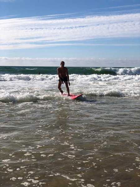 Nachdem die Hälfte der Zeit in Südfrankreich verstrichen war, sammelten Thomas Boßmann zwei Freunde aus Kiel in Bordeaux ein und weiter ging die Fahrt. Ab diesem Zeitpunkt brachte der mitgebrachte Wohnwagen die drei Urlauber voran. Ein weiteres Highlight wartete dann in der dritten Woche auf Thomas Boßmann. Endlich schaffte er es, die Wellen zu surfen, bevor sie brachen. „Das war ein unglaubliches Gefühl. Selbst wenn man nur draußen auf seinem Brett sitzt und auf die nächste Welle wartet, ist das ein schönes Gefühl. Man ist den ganzen Tag im Wasser und in der Sonne und unterhält sich mit anderen Surfern, die einem Tipps geben, worauf man noch achten könnte.“ Während des Surfens im warmen Atlantik, bekam er sogar die Chance ein paar Fische zu beobachten.
