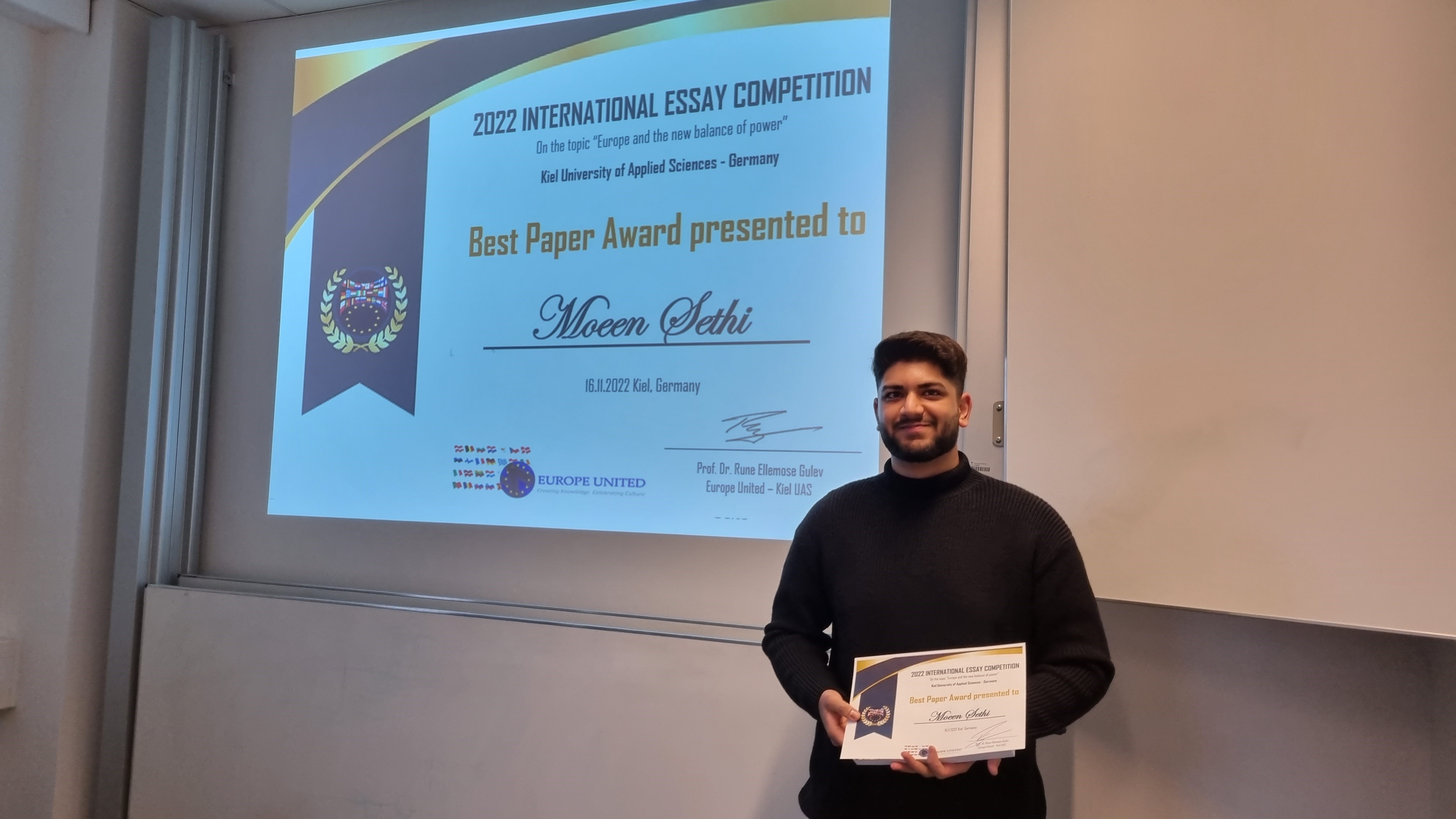 Der siegreiche Aufsatz von Moeen Sethi, Student am Fachbereich Wirtschaft, beleuchtete mehrere dieser Herausforderungen, vor denen Europa steht - vom Brexit bis hin zu einer unzureichenden Reaktion auf globale Herausforderungen. Es wird die Aussicht auf ein neues Machtgleichgewicht zugunsten der europäischen Werte vorgeschlagen. Erreichbar ist dies durch die Abkehr von nationalistischen Agenden zugunsten gesamteuropäischer Ziele. Eine integrative Strategie, die eine konstruktive Beteiligung aller europäischen Mitgliedstaaten mit klaren, gemeinsamen Zielen ermöglicht, die auf transparente und logische Weise an alle Bürger*innen Europas ohne soziale und finanzielle Schichtung weitergegeben werden.