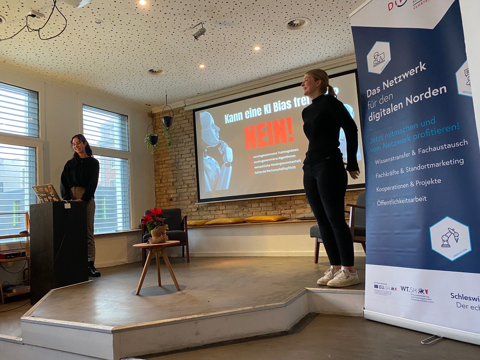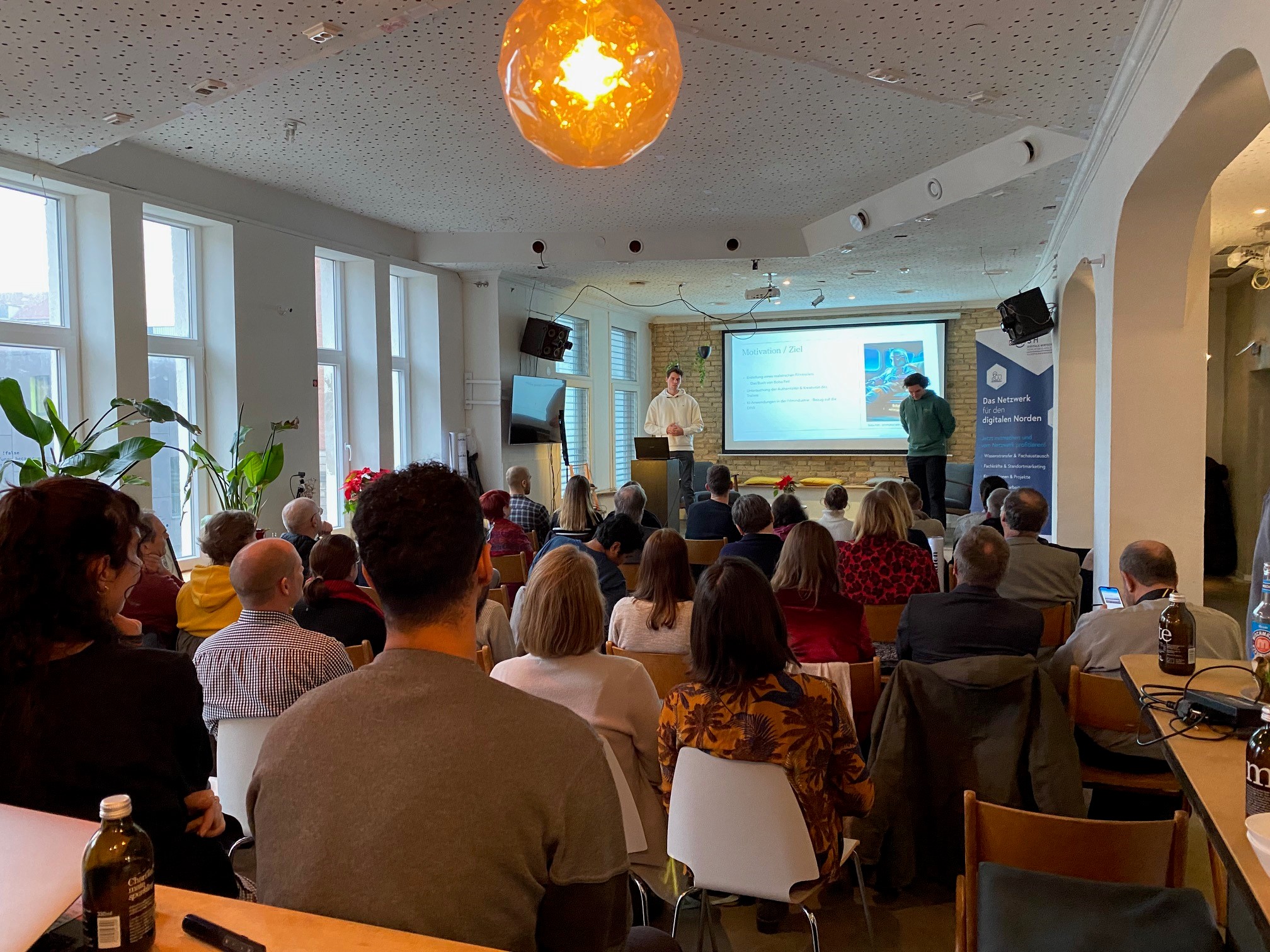 Am 19. Dezember 2023 fand im COBL in Kiel die Veranstaltung: „KI im Fokus: Ethik und Innovation in Kunst und Arbeitswelt“ als Kooperationsveranstaltung der FH Kiel mit der DiWiSH-Fachgruppe KI und Kiel.AI statt. Die Veranstaltung bot Masterstudierenden des Fachbereichs Wirtschaft die Gelegenheit, ihre Ergebnisse aus den Modulen „KI und Ethik in der Kunst“ sowie „Arbeits- und Organisationsformen der Zukunft“, geleitet von Prof. Dr. Doris Weßels, öffentlich zu präsentieren. Die Reaktion auf die Ankündigung der Veranstaltung mit den hochschnellenden Anmeldezahlen spiegelte bereits das große Interesse an diesem Veranstaltungsangebot wider. Das Platzangebot reichte kaum aus, aber nach der Bereitstellung weiterer Stühle konnte es pünktlich um 12:30 Uhr losgehen.