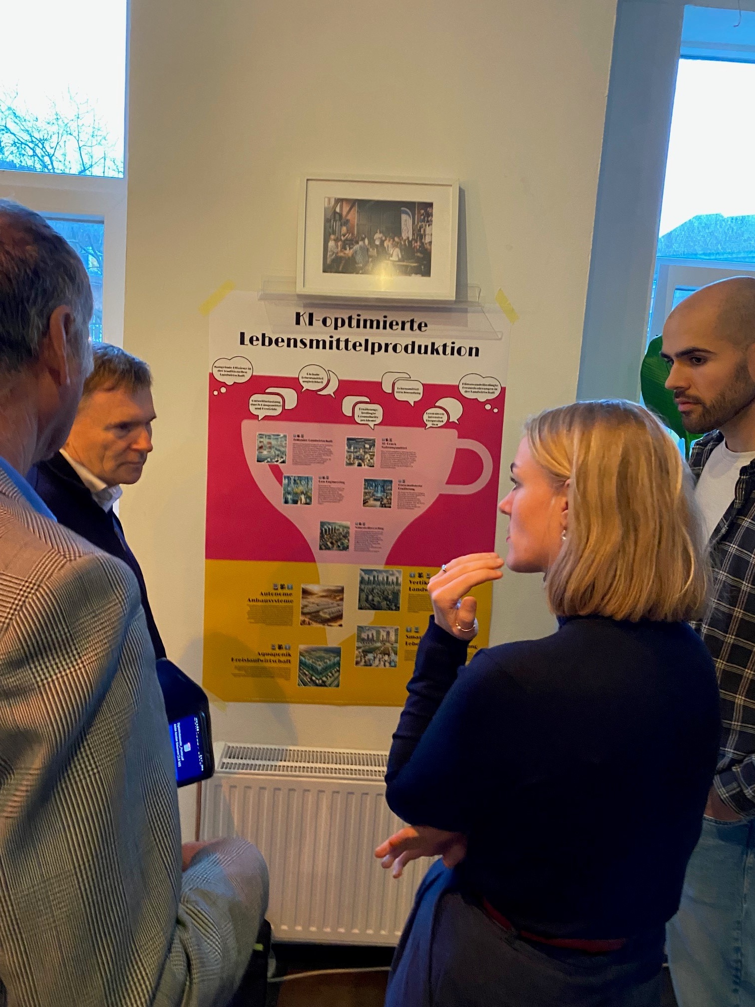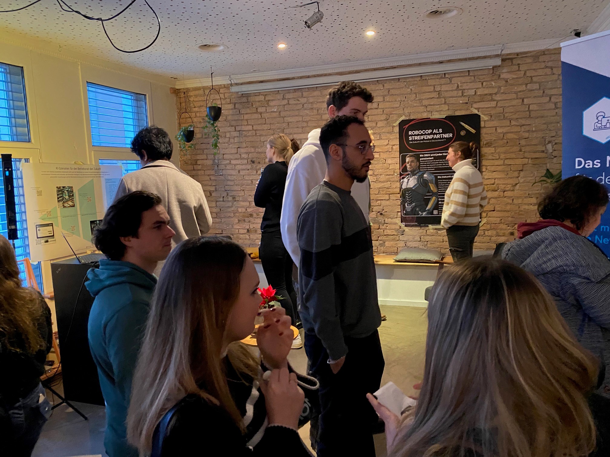 Im zweiten Teil der Veranstaltung präsentierten die Studierenden des Moduls „Arbeits- und Organisationsformen der Zukunft“ ihre Arbeiten anhand von hybriden Postern mit QR-Codes, die auf einzelne Aspekte zu verschiedenen Themen aus den Bereichen Politik, Wirtschaft, Produktionsmethoden und staatlicher Institutionen verwiesen. Auch hier bot sich ein beeindruckendes Potpourri an Themen mit visionären Gedankenspielen: Der Digital Ambassador und die Diplomatie der Zukunft, die KI-optimierte Lebensmittelrevolution, ein neuartiges KI-System für die Rekonstruktion am Tatort bei Gewaltverbrechen in Deutschland, ein Einblick in die KI-Revolution für das Lehren der Zukunft, KI-Szenarien für den Betriebsrat der Zukunft und der Robocop als Streifenpartner für den Polizeieinsatz in Deutschland.