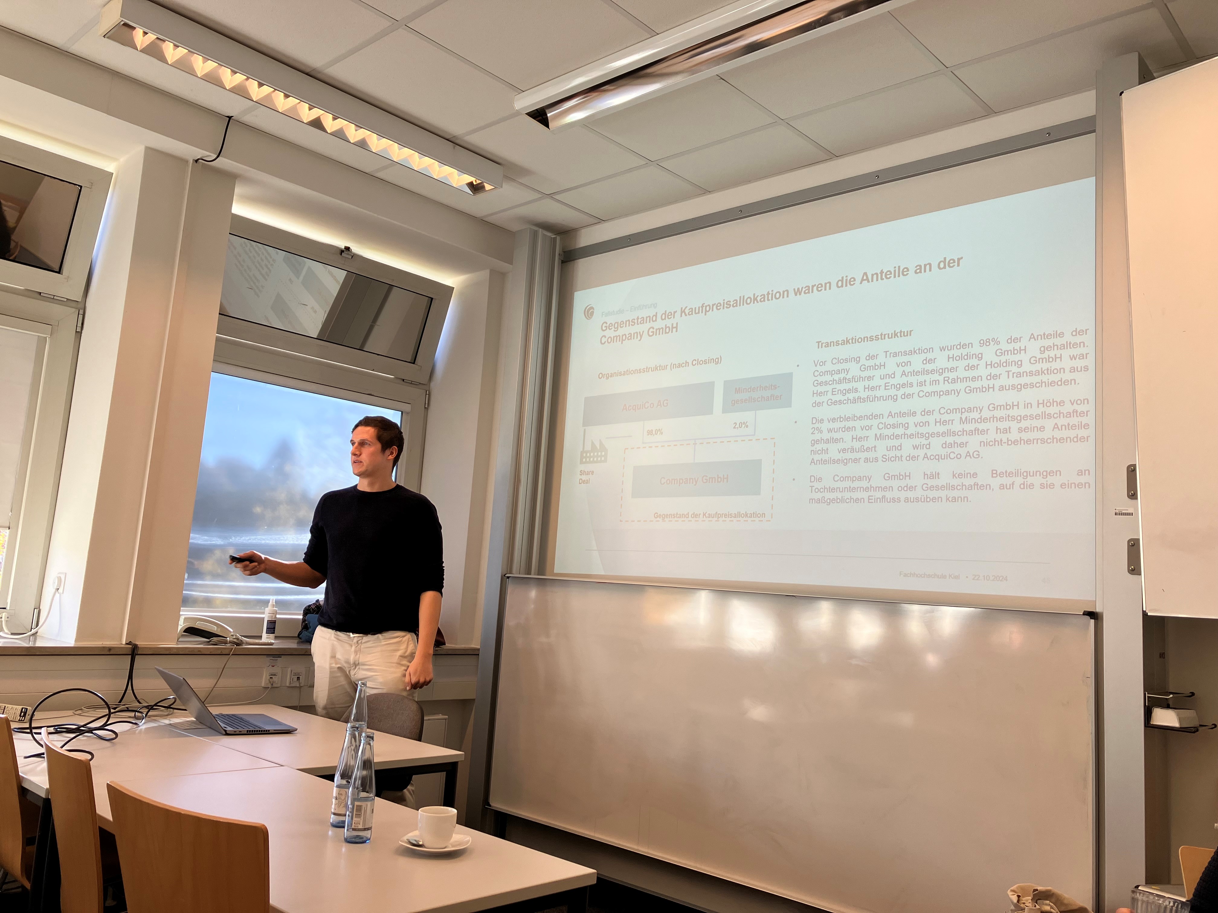 Die Studierenden des Kurses „IFRS und Konzernrechnungslegung“ im FACT-Master hörten gemeinsam mit dem Modulverantwortlichen Prof. Dr. Karsten Eisenschmidt am 22.10.2024 im Rahmen ihrer Vorlesung einen spannenden und interessanten Praxisvortrag von Baker Tilly, einer der international führenden Wirtschaftsprüfungs- und Steuerberatungsgesellschaften. Odile Benecke, Steuerberaterin und Partnerin bei Baker Tilly im Bereich IFRS Advisory, und Tim Luca Hillert, Senior im Bereich IFRS Advisory, kamen eigens hierfür aus Hamburg an die FH Kiel und gaben spannende und aufschlussreiche Einblicke zur Erstellung einer PPA. Nach Vorstellung der theoretischen Grundlagen wurde am Beispiel einer Fallstudie der Prozess dargestellt und insbesondere unter Einbindung vieler kleiner realer Praxisbeispiele die Herausforderungen und Gestaltungsspielräume in der Bilanzierung aufgezeigt. Die zahlreichen Ermessensspielräume und die Anwendung der diversen Bewertungsverfahren mit den unterstellten Planungsprämissen ermöglichen eine gezielte Bilanzpolitik, die sich häufig primär am Risikoprofil des CFO orientiert.