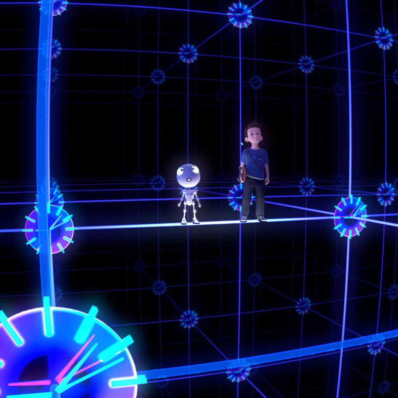 Beschreibung: ALBY erklärt Limbradur die Zusammenhänge von Raum und Zeit