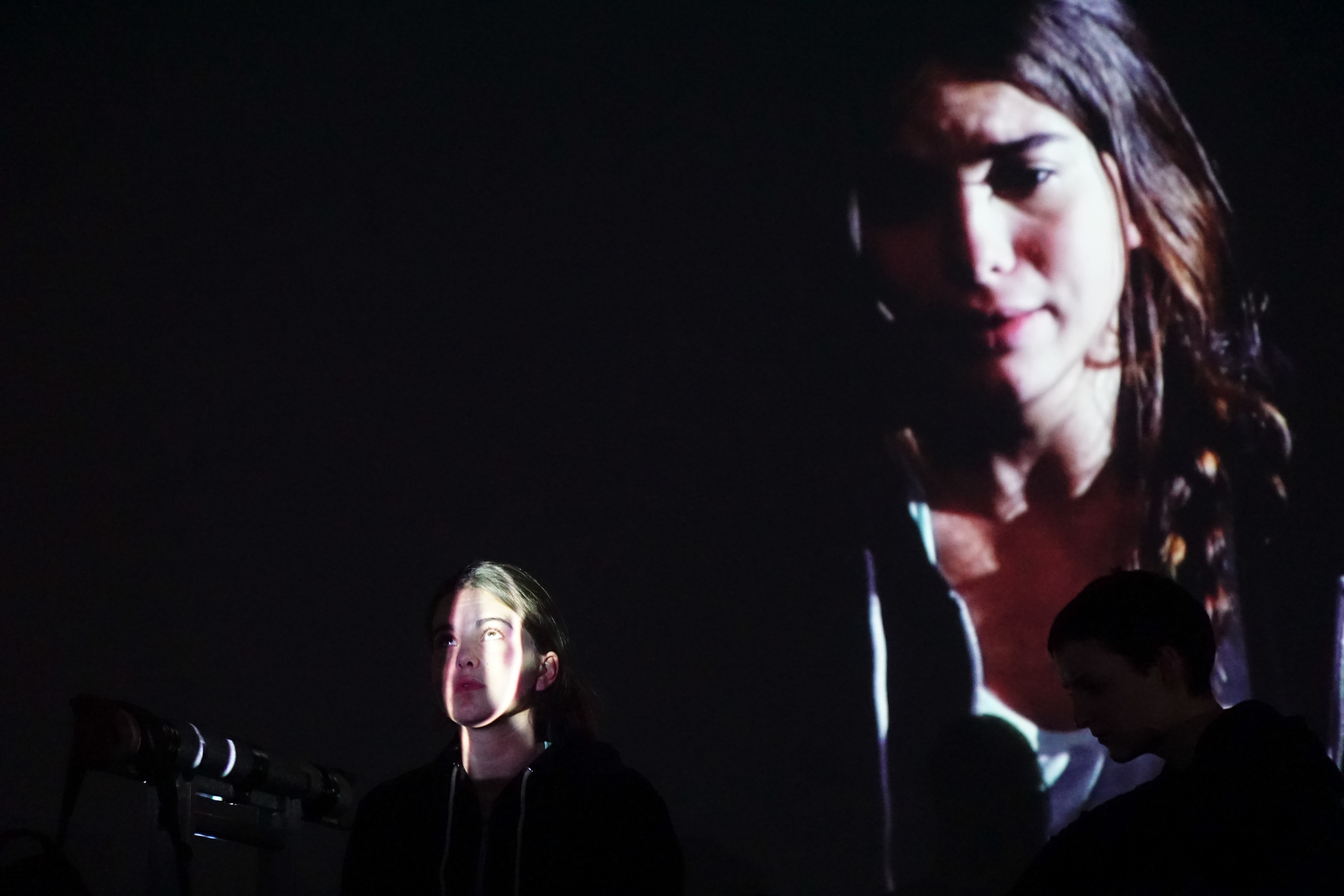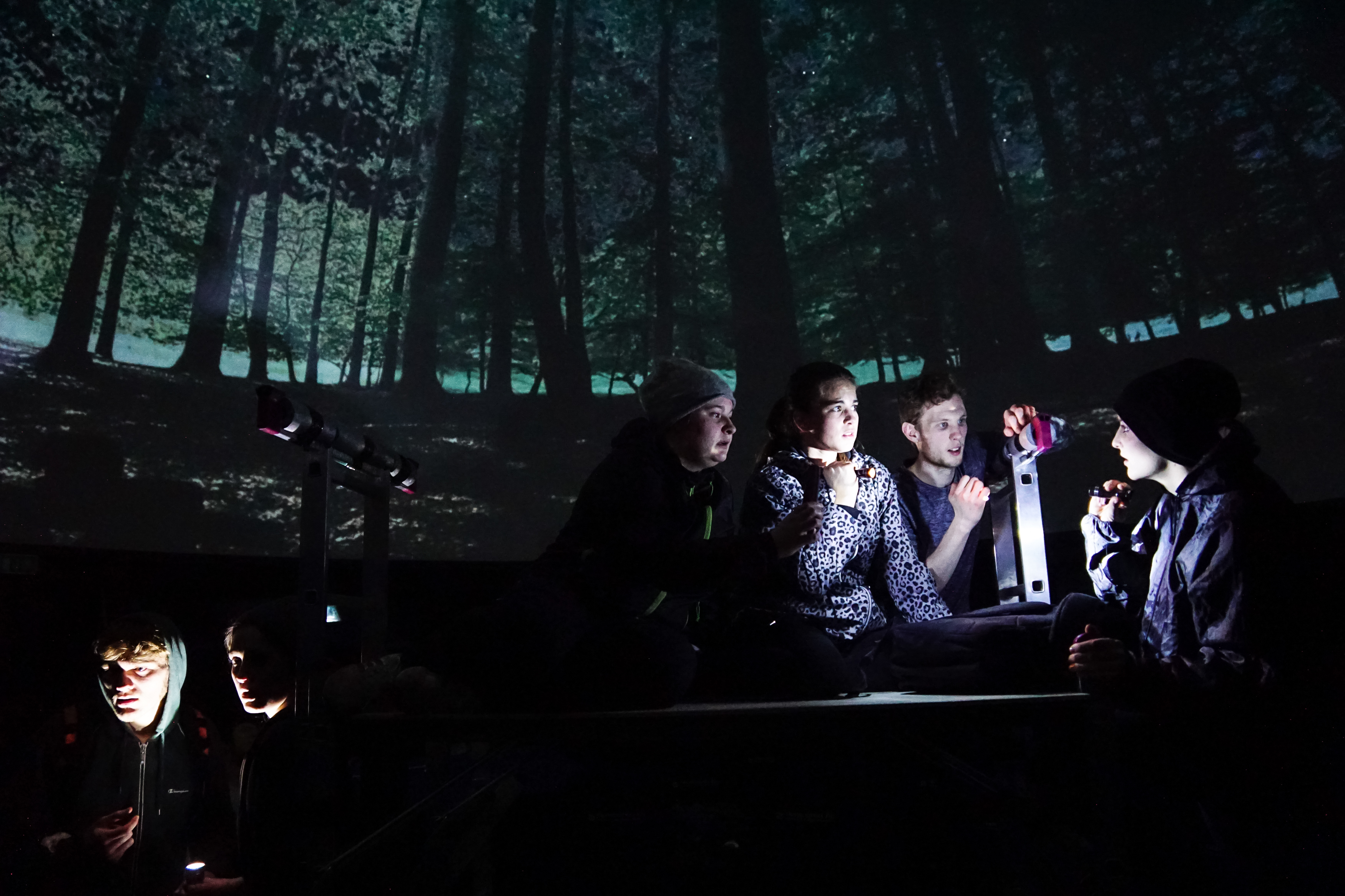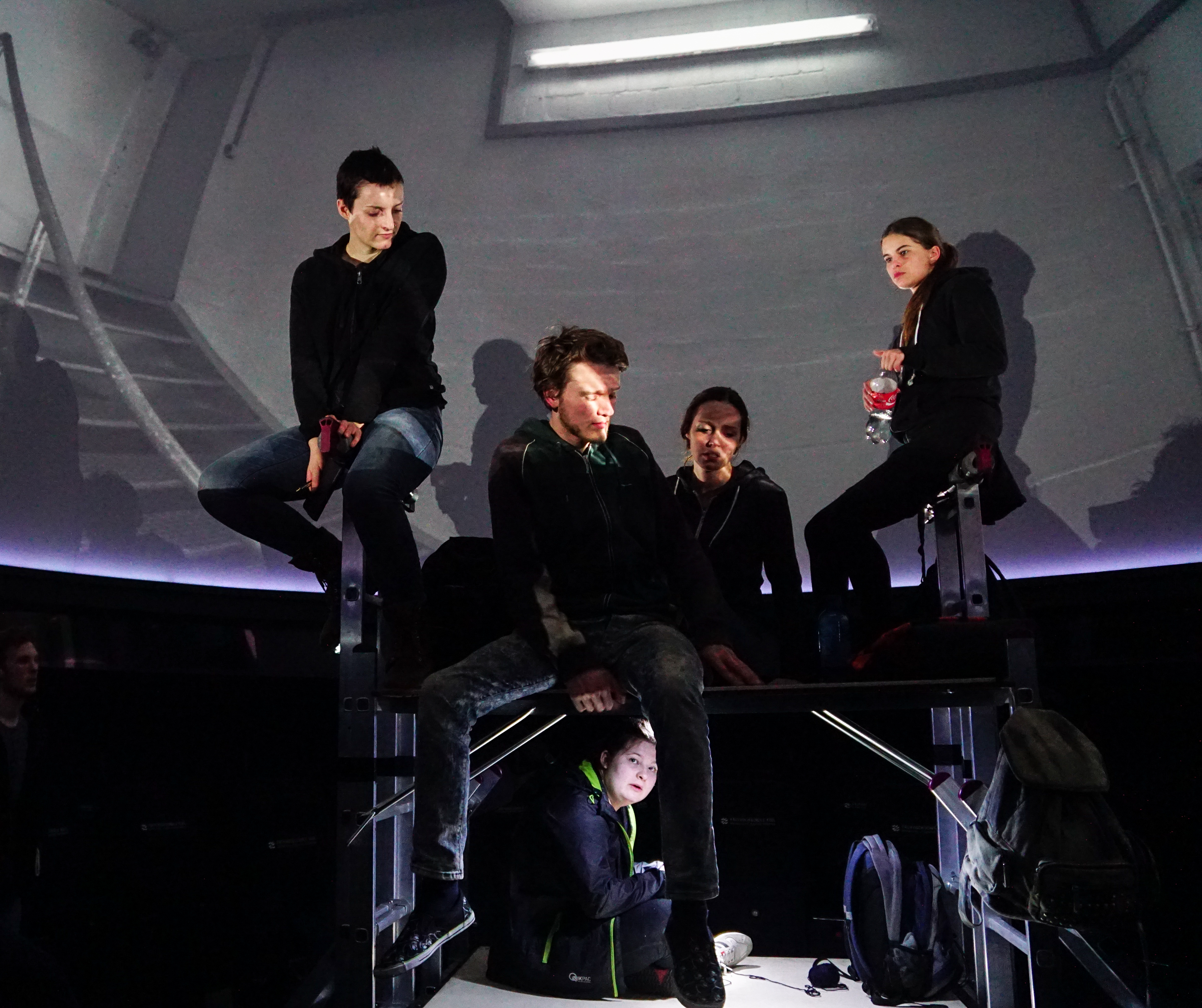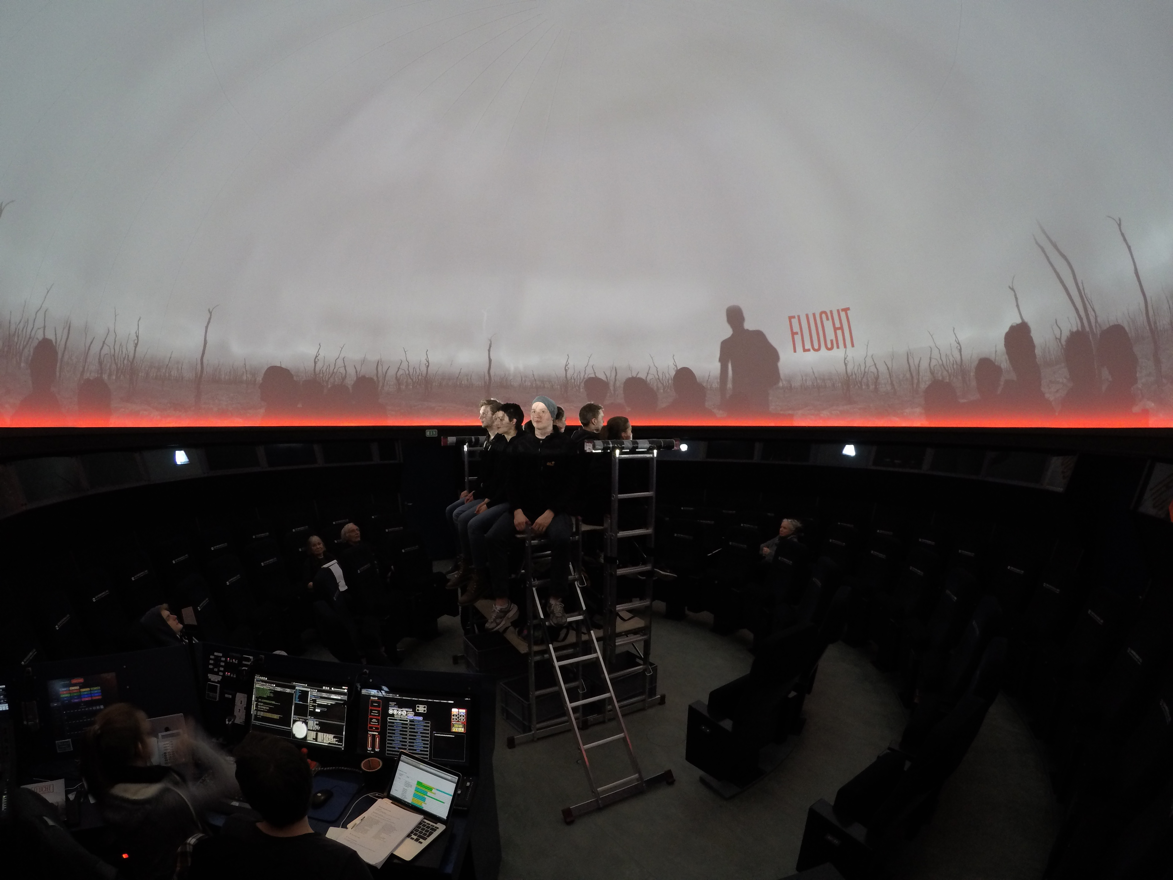 Infotext: Das Theaterstück FLUCHT ist eine multimediale Inszenierung eines dystopischen Zukunftsszenarios, welches an das Buch „Krieg: Stell dir vor, er wäre hier“ von Janne Teller angelehnt ist. FLUCHT erzählt die Geschichten von acht jungen Menschen, die ihre Heimat verlassen und sich auf eine lebensbedrohliche Flucht begeben. Die Schule für Schauspiel führte Regie und schrieb das dazugehörige Drehbuch, die mediale Aufbereitung des Stückes wurde von Multimedia Production-Studierenden konzipiert und produziert. Im Rahmen des Projektes entstanden Allsky-Fotografien, FulldomeVideos, 3D-Audio-Klanginstallationen, technische Programmabläufe im Digistar und umfangreiches Marketing-Material (Print und Digital).