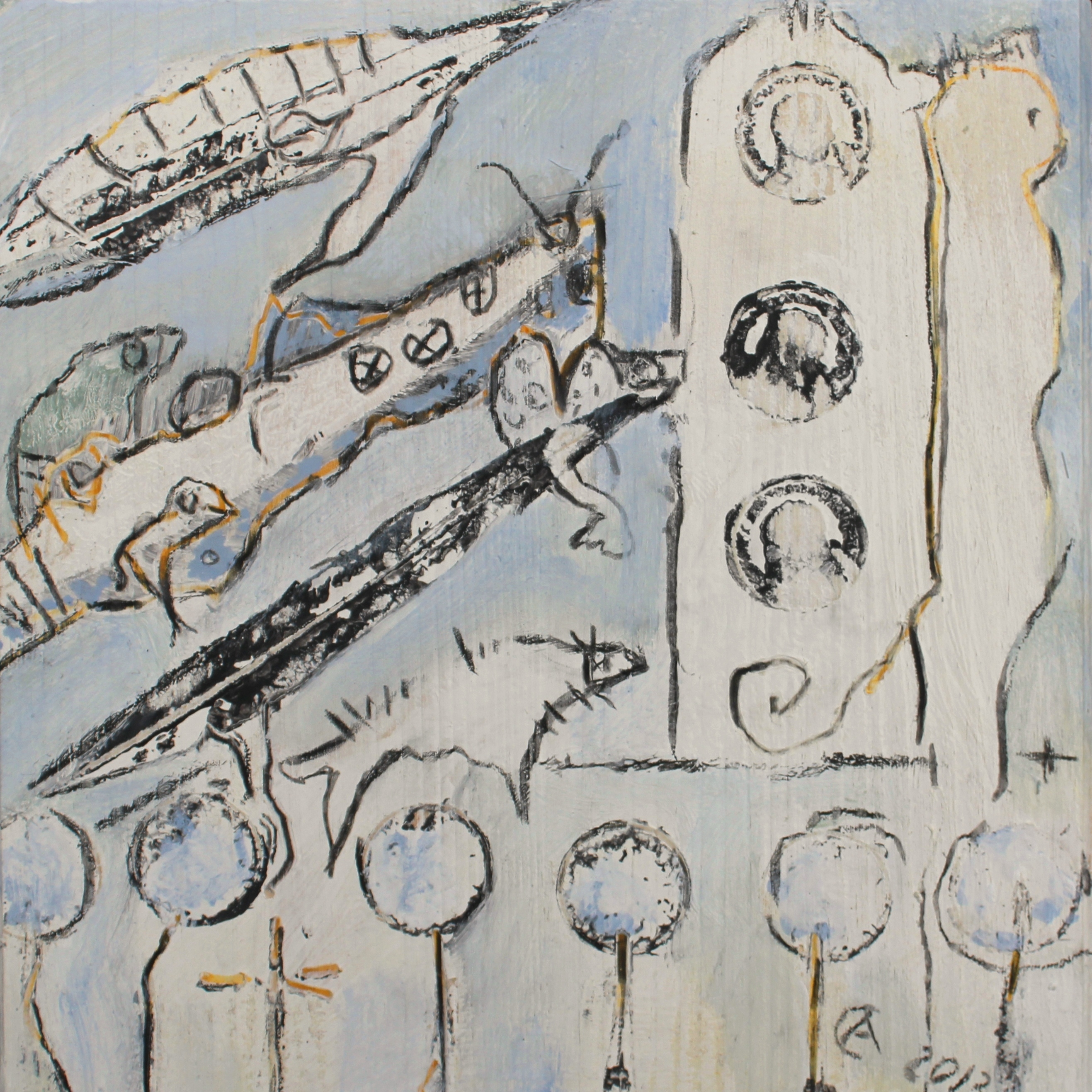 Darüber hinaus präsentiert Arno Neufeld Malereien und Objekte, die er überwiegend aus seinem erzählerischen Fundus entwickelt hat. „In einem vielfältigen Gewebe aus Formen und Zeichen zeigen sie kleine Geschichten, die dem spontanen Zugriff entspringen und sich ihren Weg im Bildaufbau suchen“, erklärt er. Jede Betrachterin und jeder Betrachter könne immer wieder Neues entdecken. Die überwiegend in Acryl gemalten Bilder wirken durch den Einsatz von Farbstiften leicht und facettenreich. Eigenwillige Formate wie 200 mal 20 Zentimeter große „longboards“ oder „Litfäßchen“, Röhren von etwa zehn Zentimetern Durchmesser und 38 Zentimetern Höhe, verstärken die Aussagekraft von Neufelds Ausstellung und ergänzen diese um weitere Formenvielfalt.