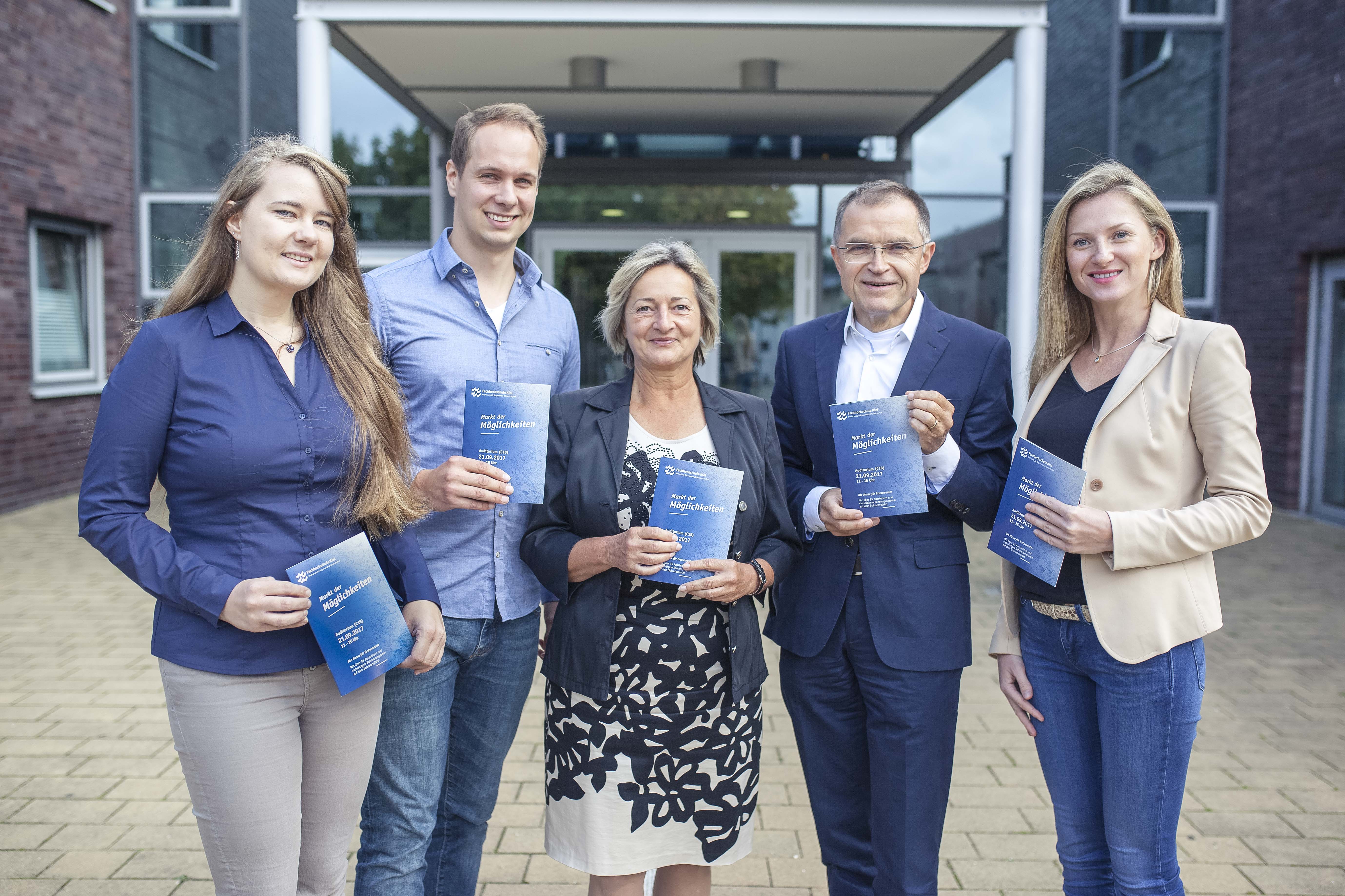 BU (v.l.n.r.): Im Auftrag des Präsidiums organsierten Inga Nissen, Carsten Höhn, Beate Lohre und Katja Baydova (r.)den ersten fachbereichsübergreifenden Markt der Möglichkeiten. Prof. Hans Klaus (2.v.r.) hatte das Format vor einigen Jahren gemeinsam mit Sabrina Mund (nicht im Bild) für den Fachbereich Wirtschaft ins Leben gerufen. (Foto: FH Kiel)