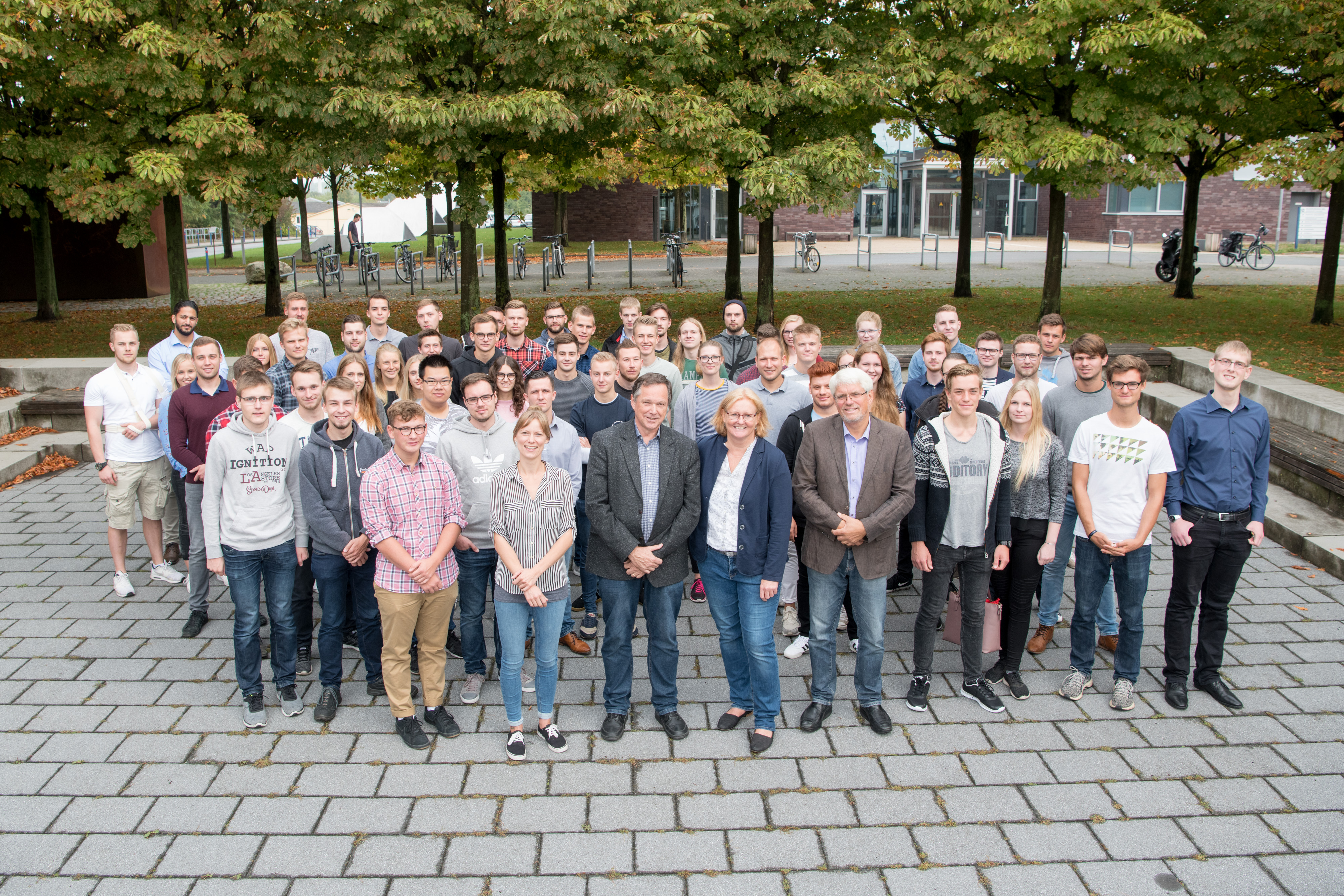 (BU: Begrüßt von FH Kiel-Präsident Prof. Dr. Udo Beer begannen heute, 7. September 2018, 56 junge Männer und Frauen ihr IBS-Studium an der FH Kiel. Foto: Andreas Diekötter.)