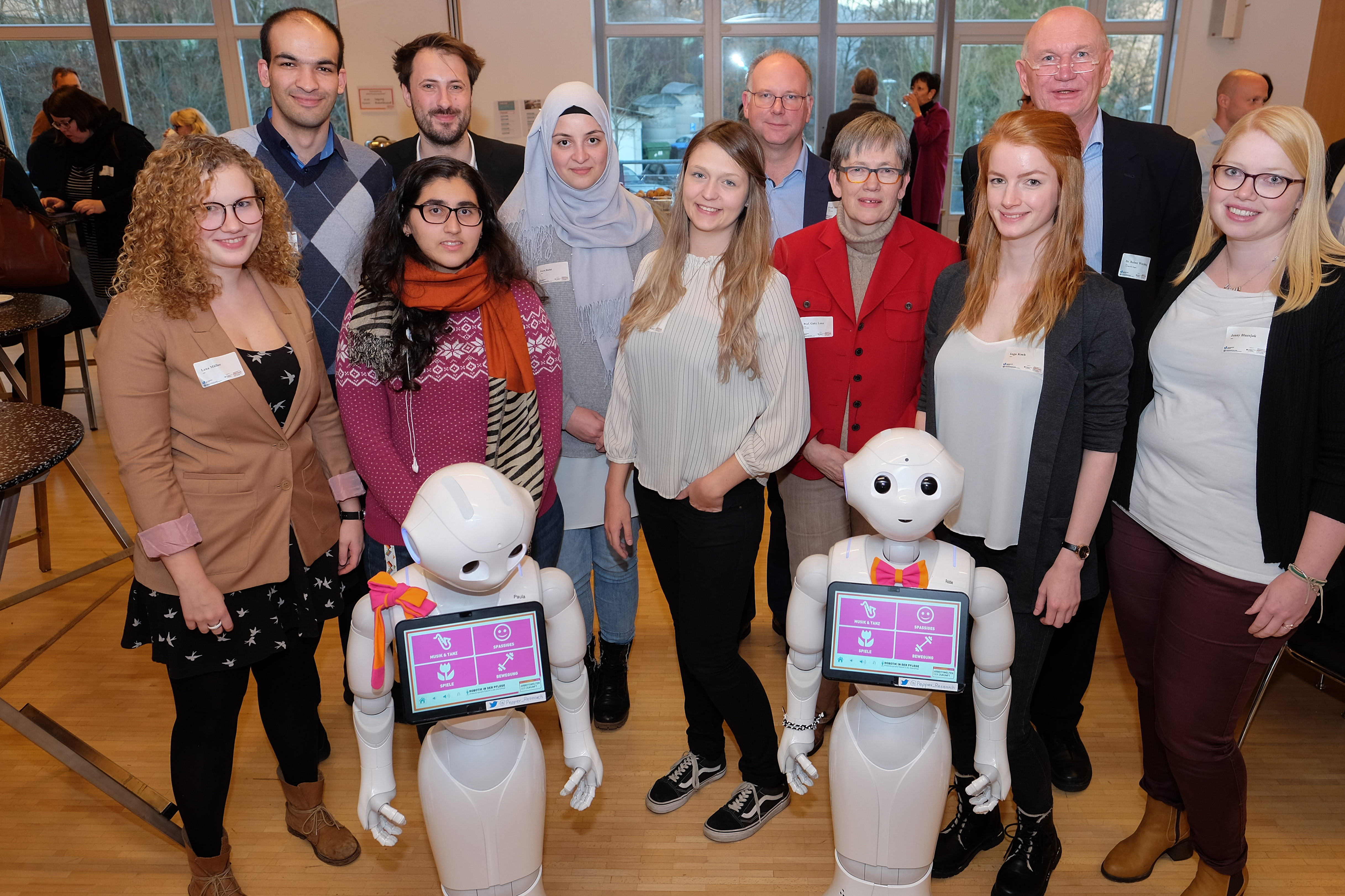(BU: Die Forscher*innen mit zwei Pepper-Robotern. Foto: Uni Siegen)