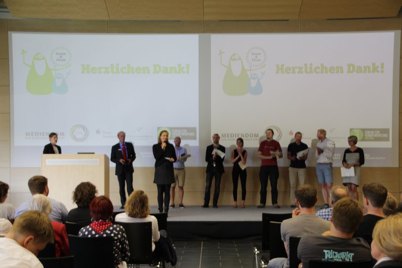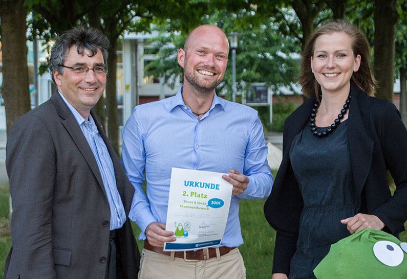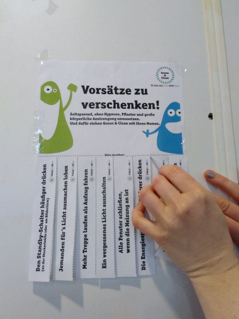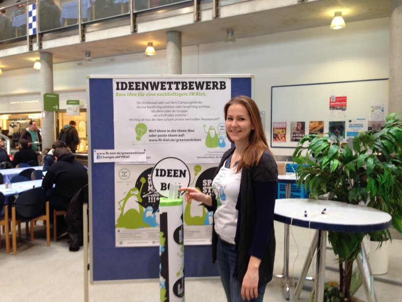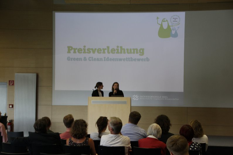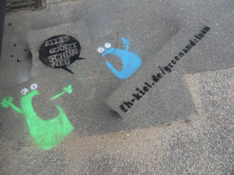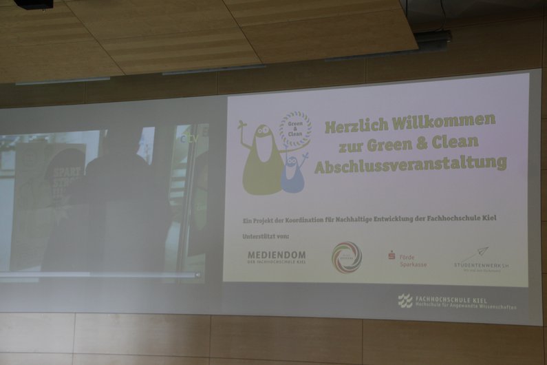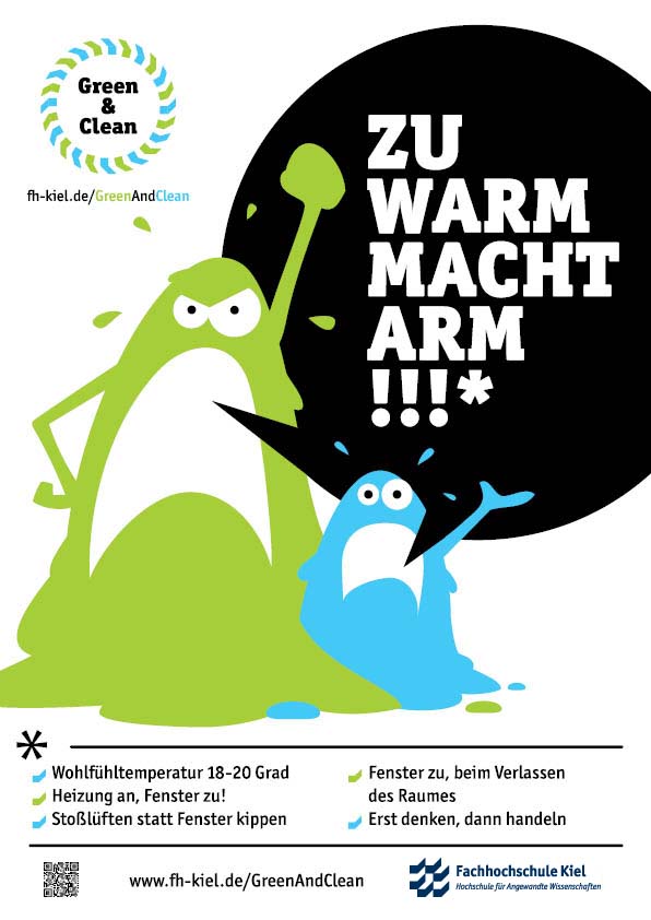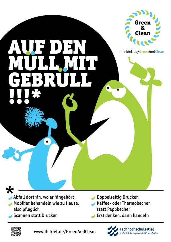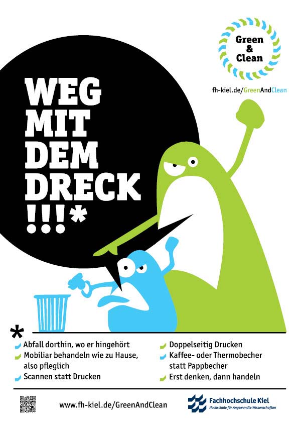 Der Ideenwettbewerb „Green & Clean“ war Teil der gleichnamigen Kampagne die ein Team um Katharina Sander, Koordinatorin für Nachhaltige Entwicklung, gemeinsam mit einer Kommunikationsagentur entwickelt und umgesetzt hatte. Ziel der Kampagne war die Förderung eines bewussteren Verhaltens in den Bereichen Energie, Abfall und Mobilität an der FH Kiel. Die Titelfiguren von Kampagne und Wettbewerb, „Green“ und „Clean“, sind seit September 2015 überall auf dem Campus auf verschiedenen Plakaten und Aufklebern zu finden. Insbesondere der Aufkleber „Ein Tuch ist genuch“, der seit September an vielen Papierhandtuchspendern klebt, führte zu reger Diskussion über die Umsetzbarkeit dieses Hinweises an der Hochschule. Für Nachhaltigkeitskoordinatorin Katharina Sander ein Erfolg: „Genau das wollten wir mit der Kampagne erreichen: Auf das Thema Klimaschutz aufmerksam machen und auf kreative Art und Weise den Austausch darüber anregen.“