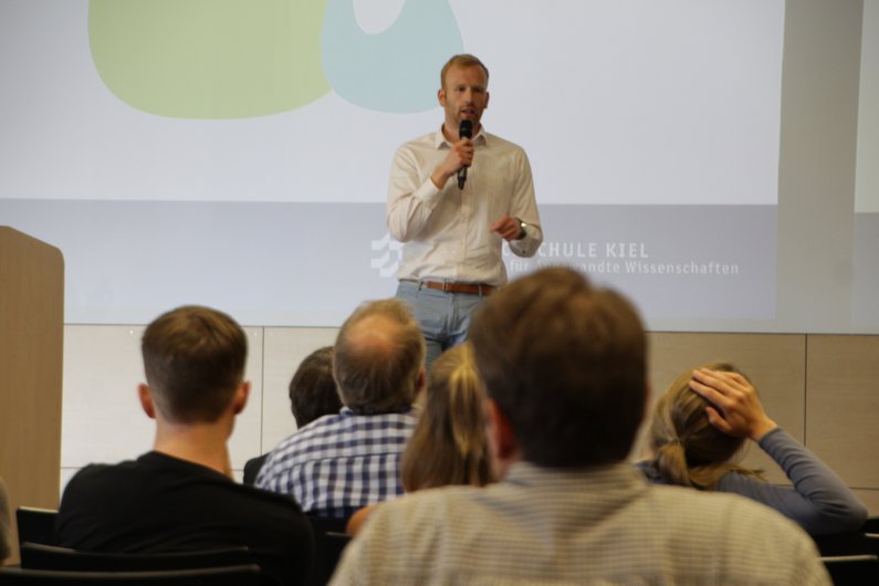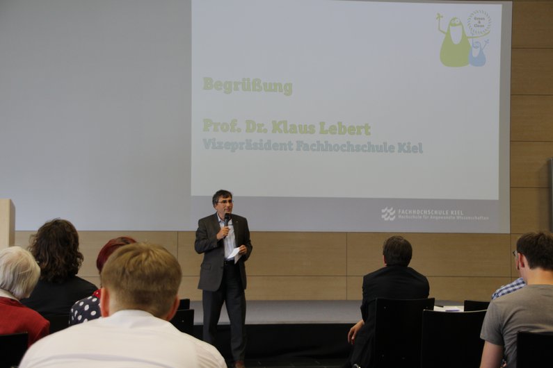 Prof. Dr.-Ing. Klaus Lebert, Vizepräsident der Fachhochschule Kiel, hob in seiner Begrüßungsansprache hervor, dass sich nicht nur Studierende, sondern auch Mitarbeitende und Lehrende mit ihren Ideen am Wettbewerb beteiligt hatten. Dies zeige den hohen Grad an Identifikation mit der Kampagne und der Hochschule, so Lebert.