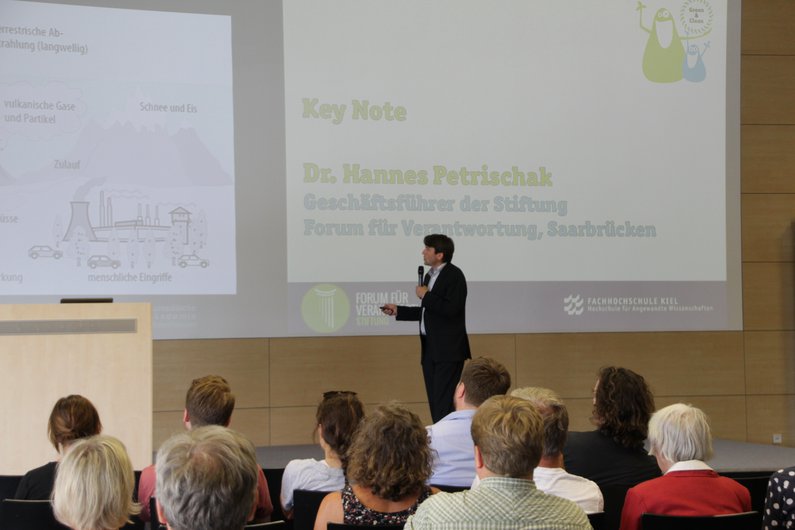 Den Einstiegsvortrag zur gestrigen Abschlussveranstaltung hielt Dr. Hannes Petrischak, Geschäftsführer der Stiftung „Forum für Verantwortung“. Angesichts der anhaltend umfassenden Auswirkungen menschlichen Handelns auf Klima, Artenvielfalt und Stoffkreisläufe sprach er vom „Zeitalter des Anthropozäns“.