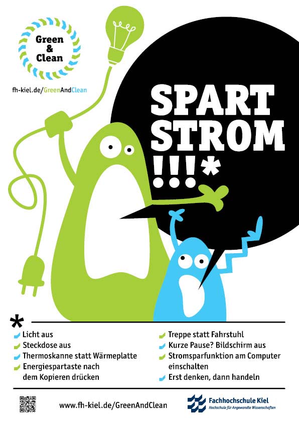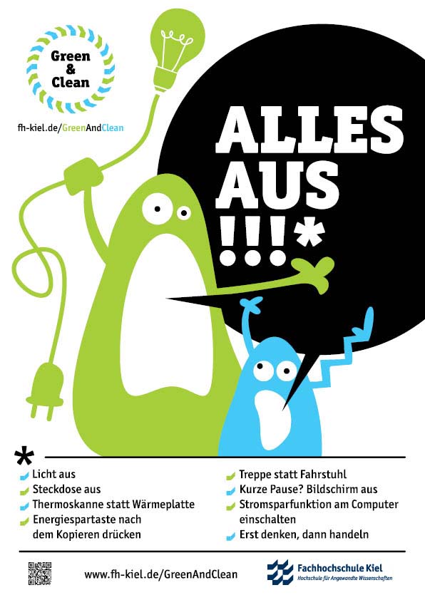 Ob Strom, Wärme, Abfall oder Mobilität, die Verbrauchs- und Emissionskurven steigen, wenn wir nicht alle etwas dagegen unternehmen. Green & Clean versuchen uns alle an der FH Kiel zum Licht ausschalten, Heizung ausdrehen oder zur Abfallvermeidung zu motivieren.