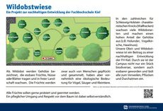 Die Obstwiesen sind im Rahmen der Bestrebungen einer Nachhaltigen Entwicklung an der FH Kiel entstanden. Sie wurden im Frühjahr 2015 gepflanzt und laden zum Verweilen und Probieren der verschiedenen, regionalen Früchte ein. Am 09. Mai 2016 eröffneten Klaus-Michael Heinze, Prof. Klaus Lebert und Katharina Sander gemeinsam die Obstwiesen hinter dem Hochhaus C03. Nicht zuletzt wegen des guten Wetters war die Eröffnung von Studierenden, Mitarbeitenden aus der Lehre, Verwaltung und Technik gut besucht. Gleichzeitig wurde die erste von insgesamt drei Figuren der Künstlerin Rosa Treß eingeweiht.