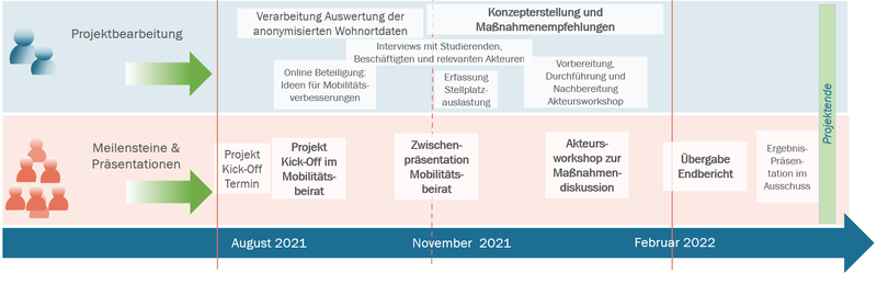 Zwischen August 2021 und September 2022 wurde in einem intensiven Beteiligungsverfahren mit Online-Befragung, Begehungen und Gesprächsrunden ein Konzept für eine nachhaltige Mobilität für die Fachhochschule Kiel erarbeitet. Basis für das Konzept war eine detaillierte anonymisierte Wohnstandort- und Erreichbarkeitsanalyse. Ein aus allen Statusgruppen zusammengesetzter Mobilitätsbeirat begleitete den Prozess.