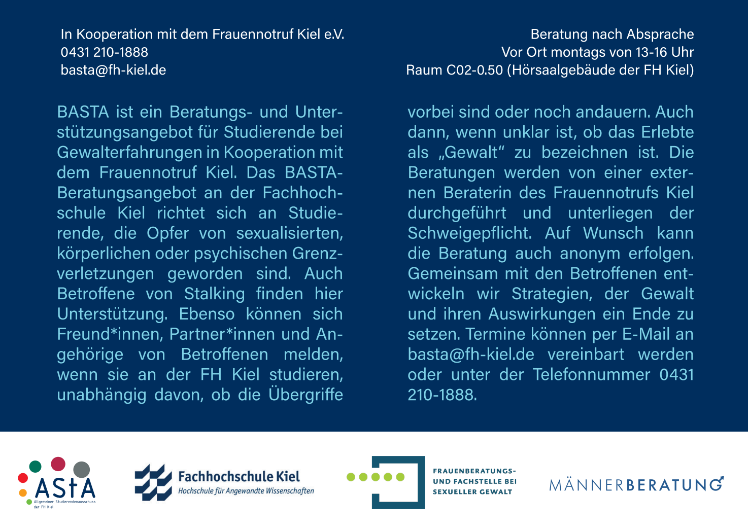 BASTA!“ bedeutet Genug! Aus! Oder Stopp! BASTA ist ein Beratungs- und Unterstützungsangebot für Studierende bei Gewalterfahrungen in Kooperation mit dem Frauennotruf Kiel.